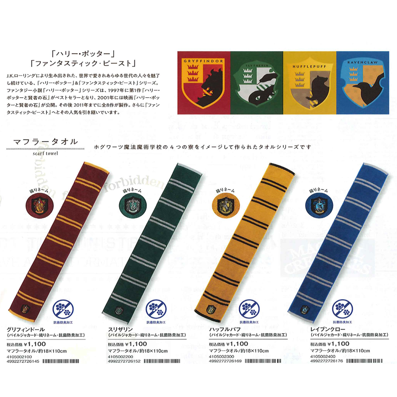 映画『ハリー・ポッター』に登場する、ホグワーツの寮生たちがつけているマフラーをイメージしたマフラータオルです。