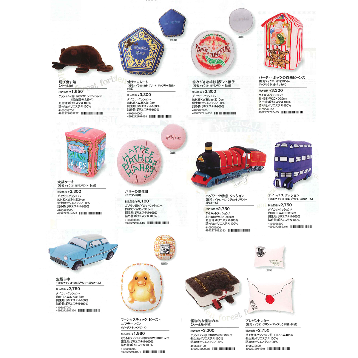 | サイズ | 【蛙チョコレート ダイカットクッション】約H35×W35×D10cm 【歯みがき糸楊枝型ミント菓子 ダイカットクッション】約H35×W35×D10cm 【バーティ・ボッツの百味ビーンズ ダイカットクッション】約H38×W20×D20cm 【大鍋ケーキ ダイカットクッション】約H32×W24×D24cm 【ホグワーツ特急 ダイカットクッション】約H18×W48×D12cm 【ナイトバス ダイカットクッション】約H30×W40×D12cm 【空飛ぶ車 ダイカットクッション】約H16×W37×D16cm 【プレゼントレター クッション】約H30.5×W40cm 【飛び出す蛙 ダイカットクッション】約H20×W13cm×D9cm(装飾部分含めず) 【怪物的な怪物の本 クッション】約H30×W20×D10cm 【ハリーの誕生日 ダイカットクッション】約H35×W35×D15cm 【魔法省 クッション】約H35×W35×D10cm 【ニフラー パン もちもちクッション】約H39×W33×D12cm |