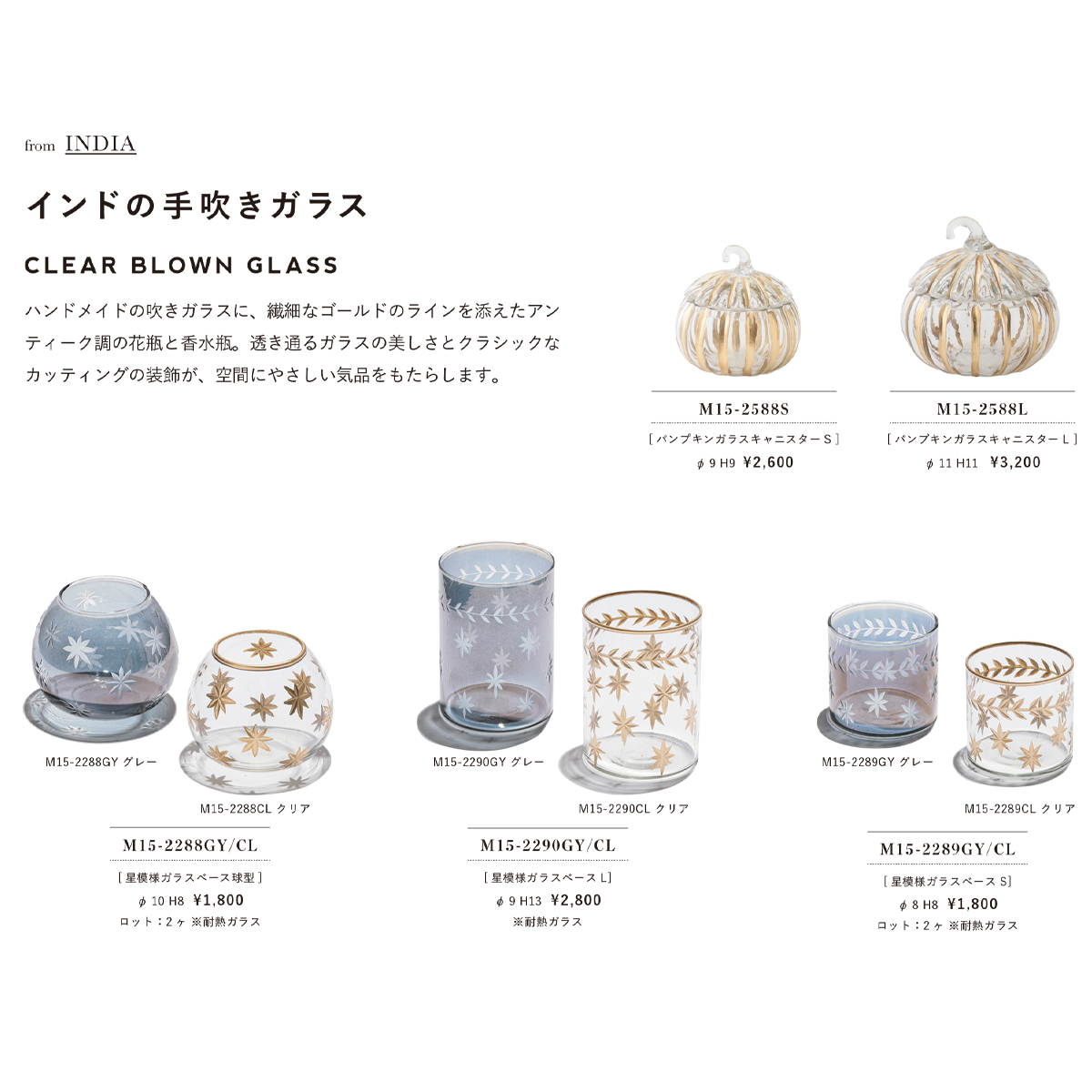 | サイズ | M15-2288CL 星模様ガラスベース 球型 クリア : φ10 H8 M15-2288GY 星模様ガラスベース 球型 グレー : φ10 H8 M15-2289CL 星模様ガラスベースS クリア : φ8 H8 M15-2289GY 星模様ガラスベースS グレー : φ8 H8 M15-2290CL 星模様ガラスベースL クリア : φ9 H13 M15-2290GY 星模様ガラスベースL グレー : φ9 H13 M15-2588L パンプキンガラスキャニスターL : Φ11 H11 M15-2588S パンプキンガラスキャニスターS : Φ9 H9 |