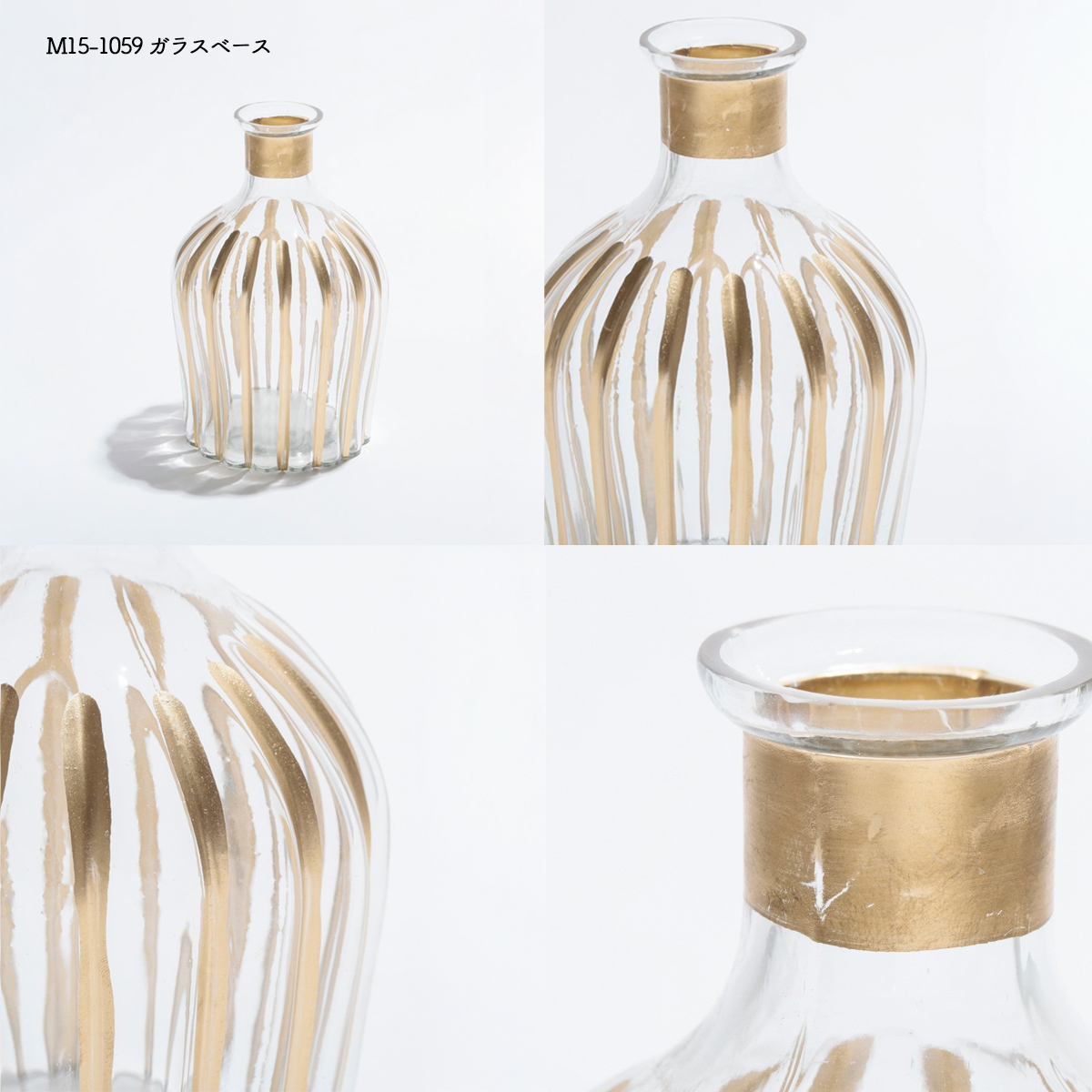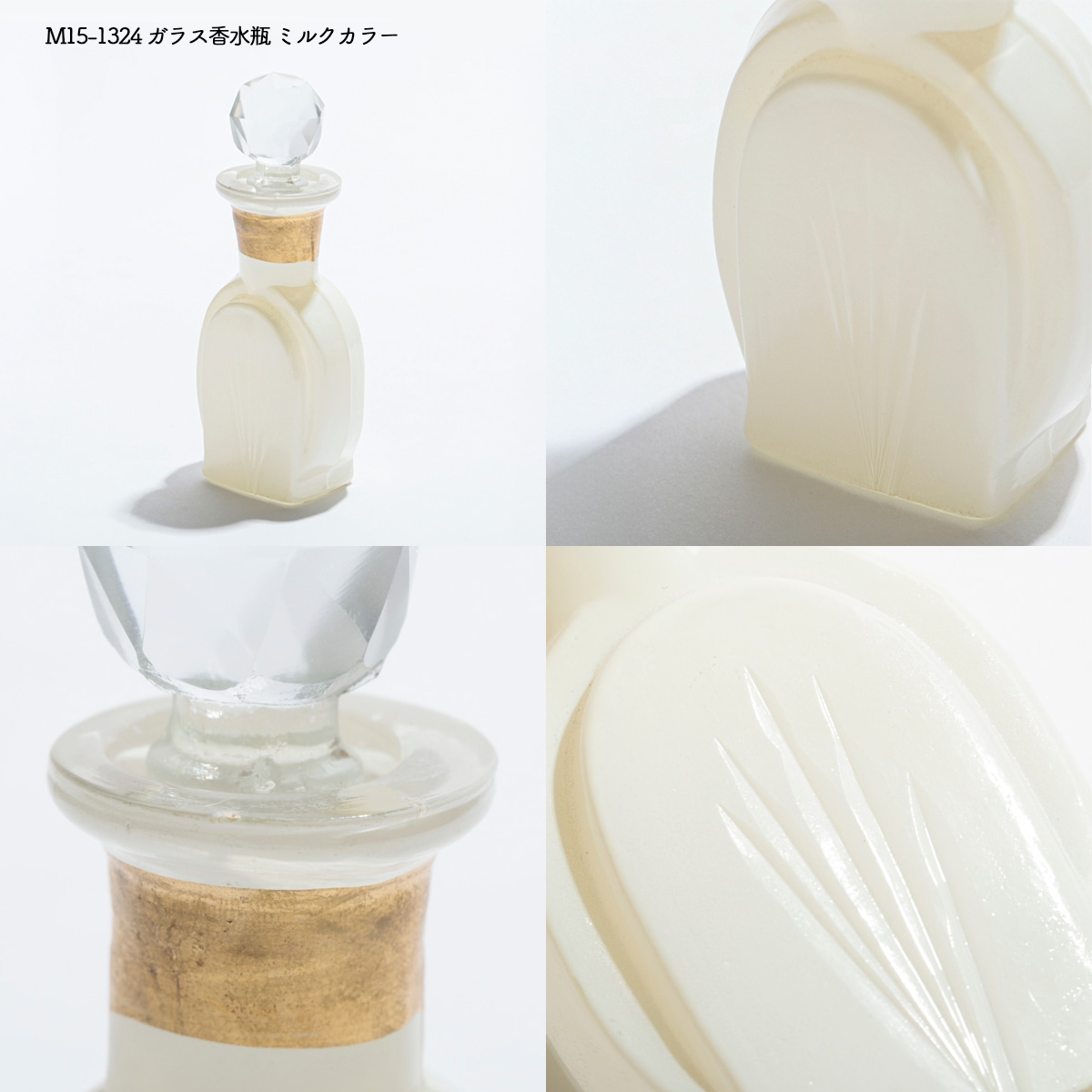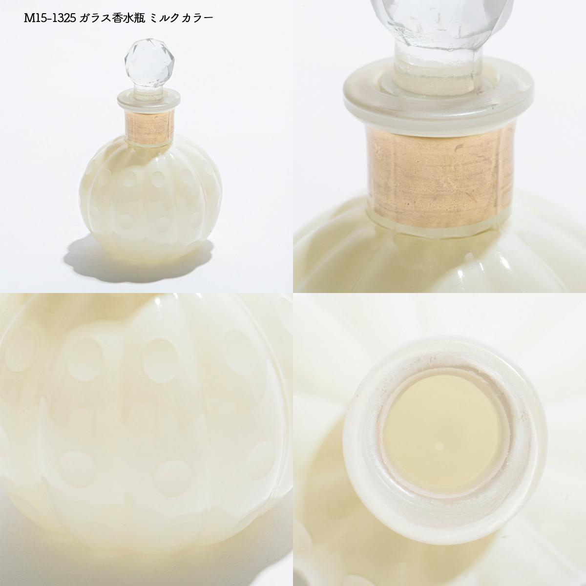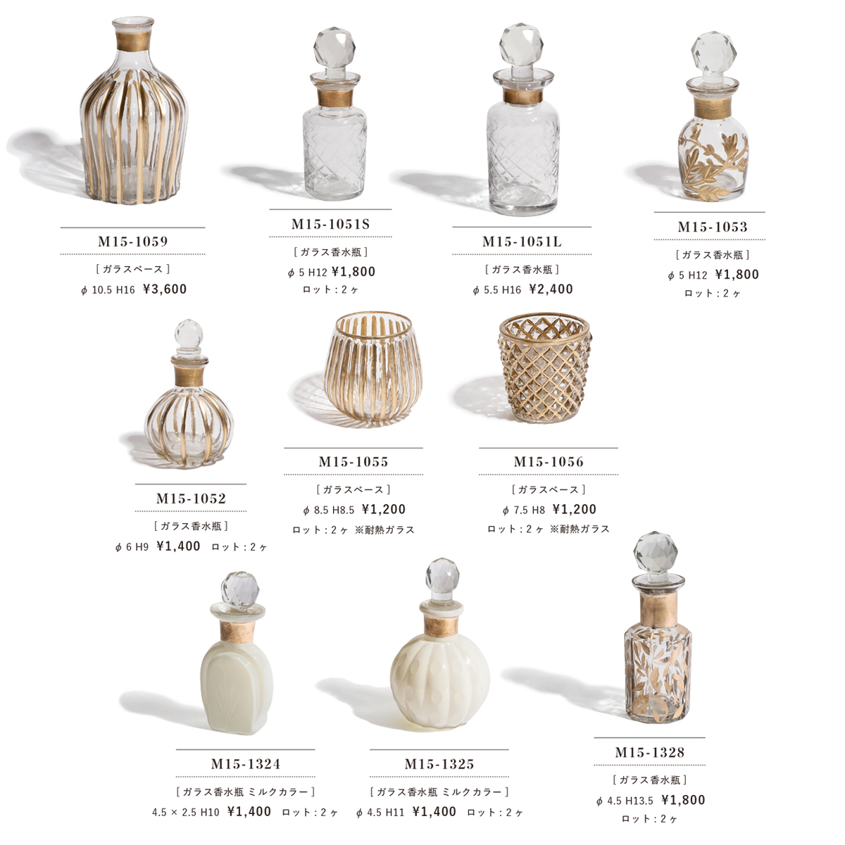 | サイズ | M15-1051L ガラス香水びん : Φ5.5 H16 M15-1051S ガラス香水びん : Φ5 H12 M15-1052 ガラス香水びん : Φ6 H9 M15-1053 ガラス香水びん : Φ5 H12 M15-1055 ガラスベース : Φ8.5 H8.5 M15-1056 ガラスベース : Φ7.5 H8 M15-1059 ガラスベース : Φ10.5 H16 M15-1324 ガラス香水瓶 ミルクカラー : 4.5 x 2.5 H10 M15-1325 ガラス香水瓶 ミルクカラー : Φ6.5 H11 M15-1328 ガラス香水瓶 : Φ4.5 H13.5 |