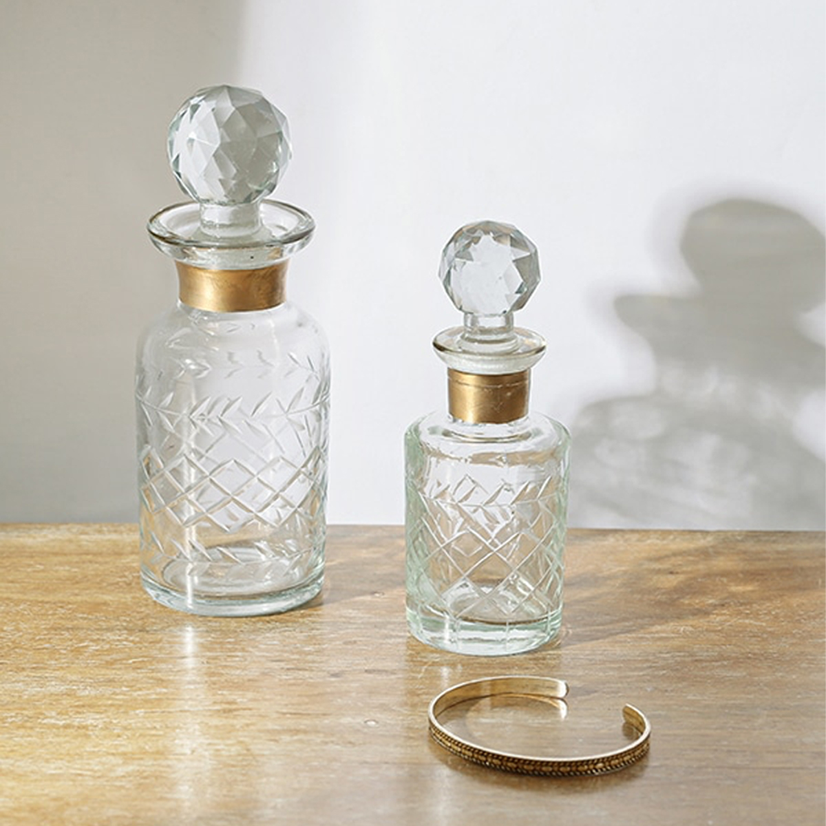 ハンドメイドの吹きガラスに、繊細なゴールドのラインを添えたアンティーク調の花瓶と香水瓶。