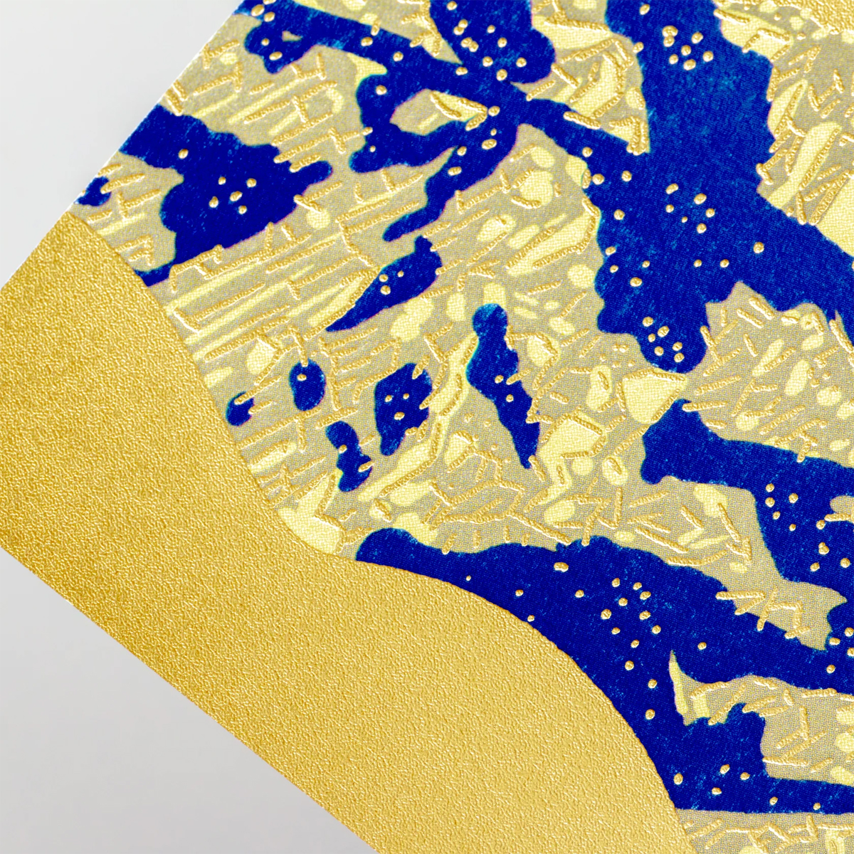 連なる山々を3つの異なる景色で描いています。山の凹凸感を際立たせるメタリックな箔と、大地や水面、雲海の質感をクリア箔で繊細に表現しました。
