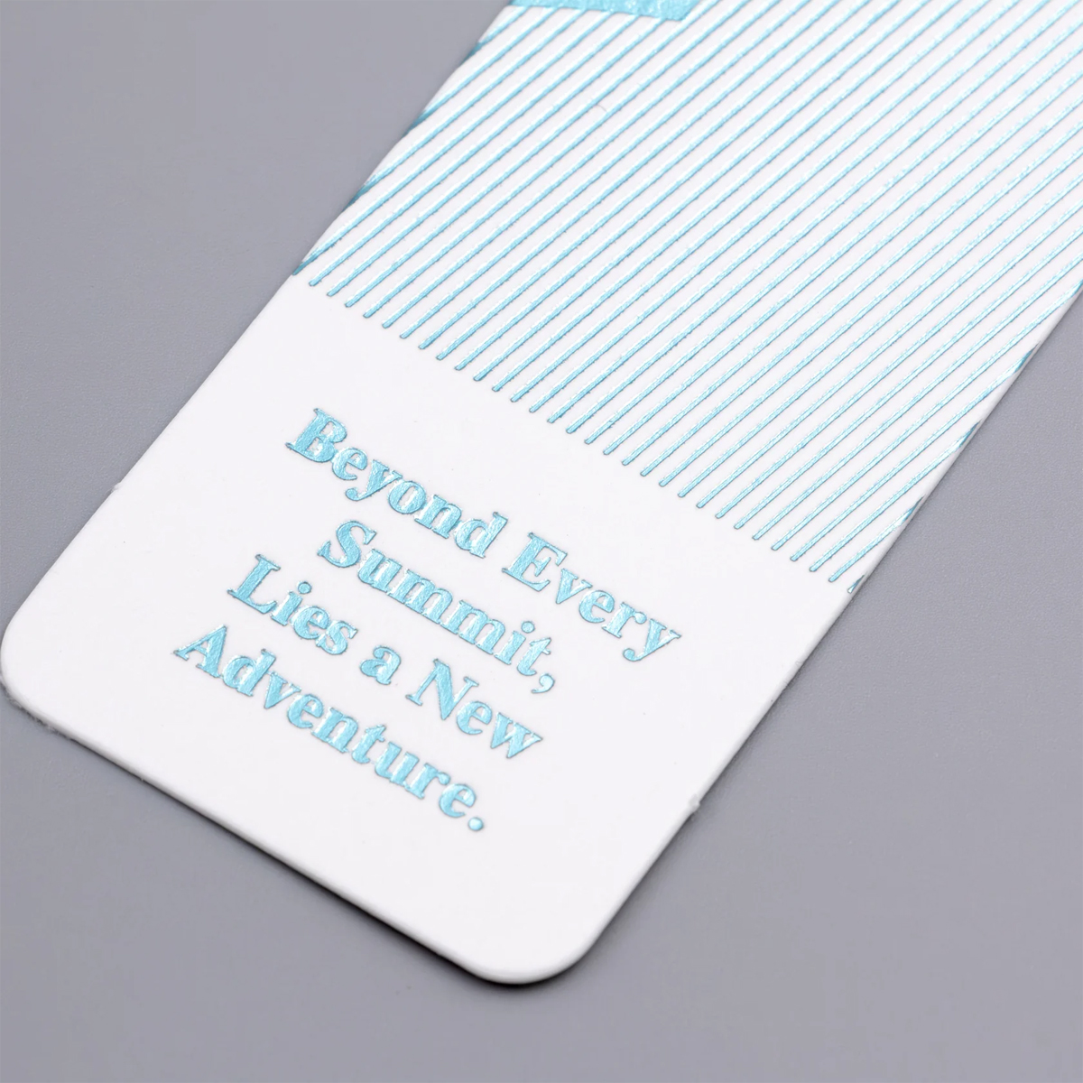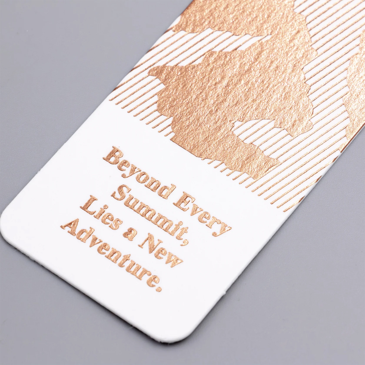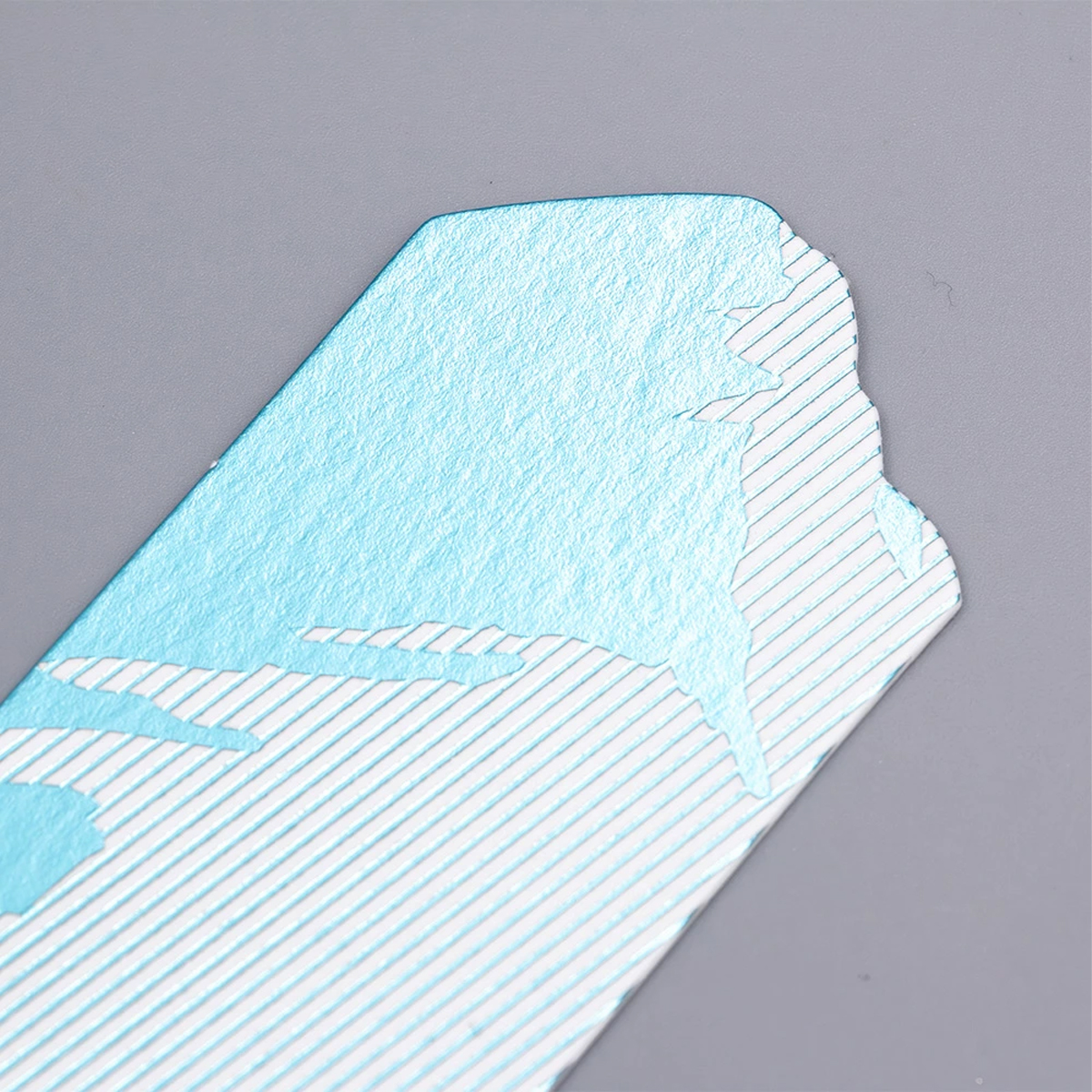 日本の四季が織りなす山のイメージを箔押し加工のみで表現した、デザイナーと職人のこだわりが詰まったしおりです。