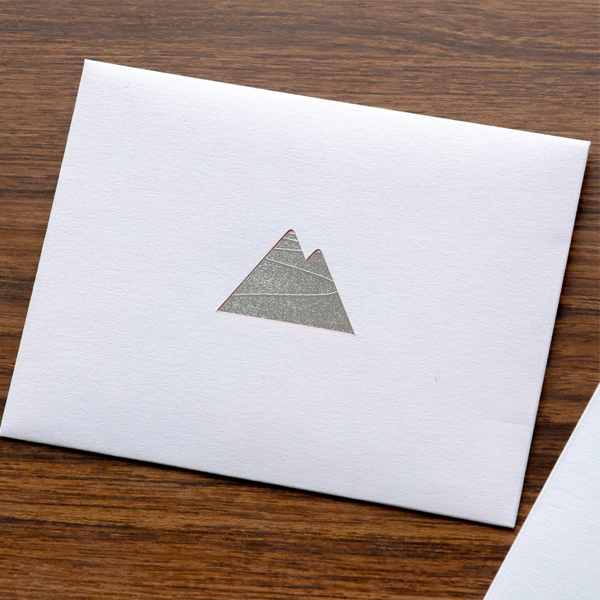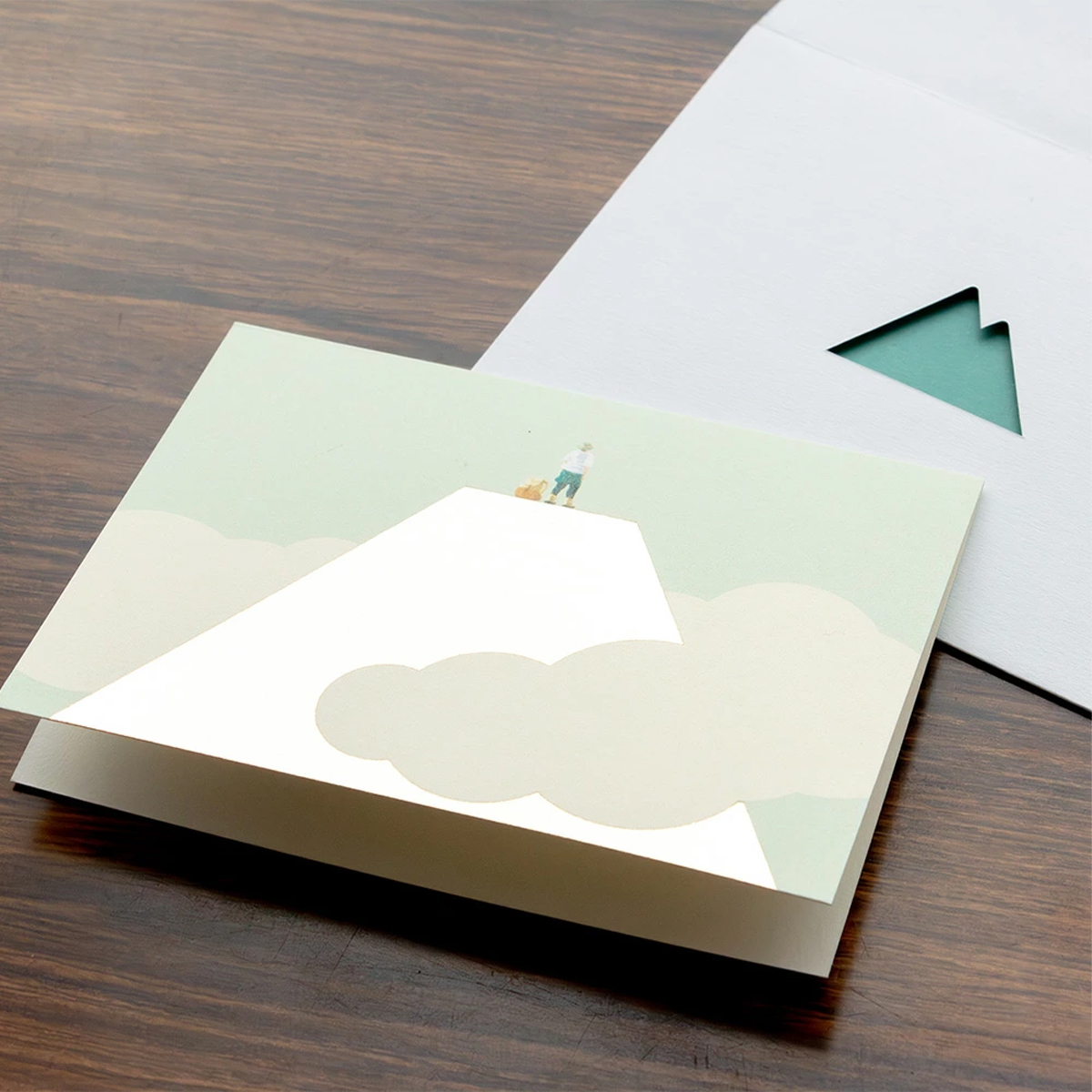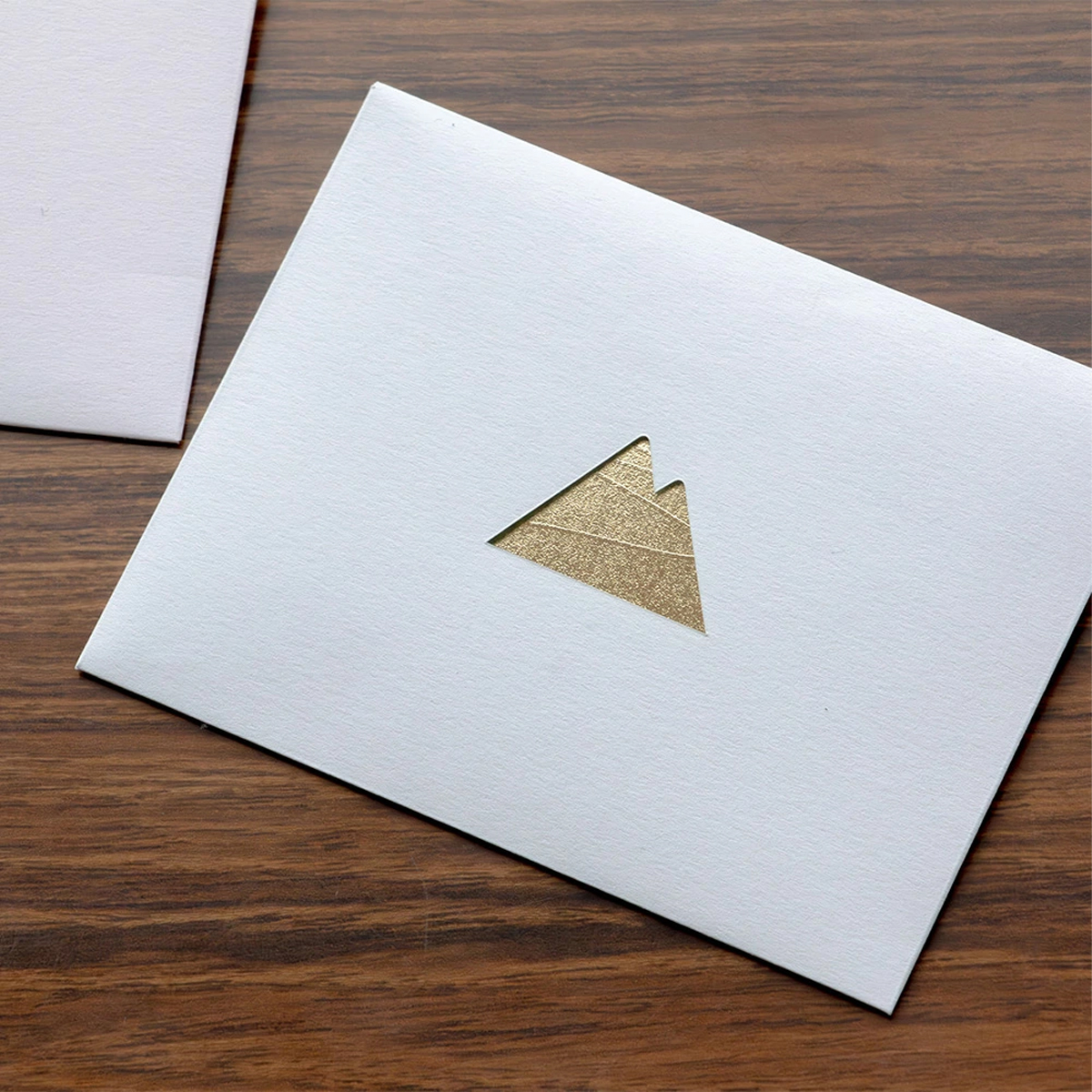 山の形に切り抜かれた封筒から見える、箔押しが目を引くデザインのメッセージカード。