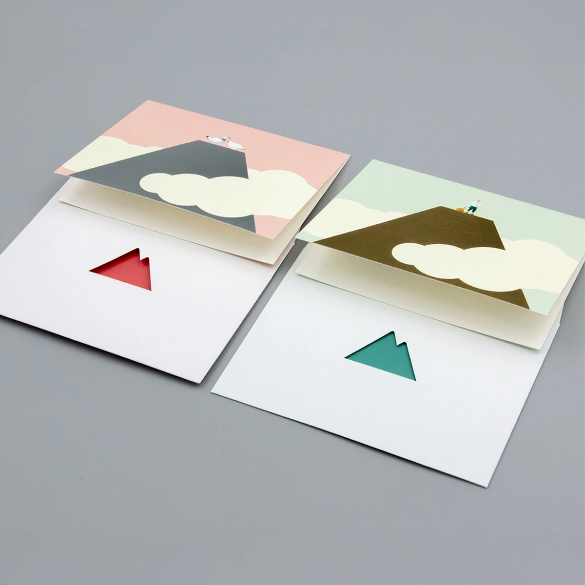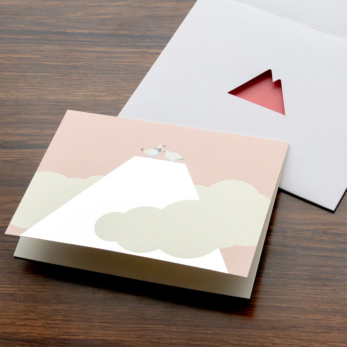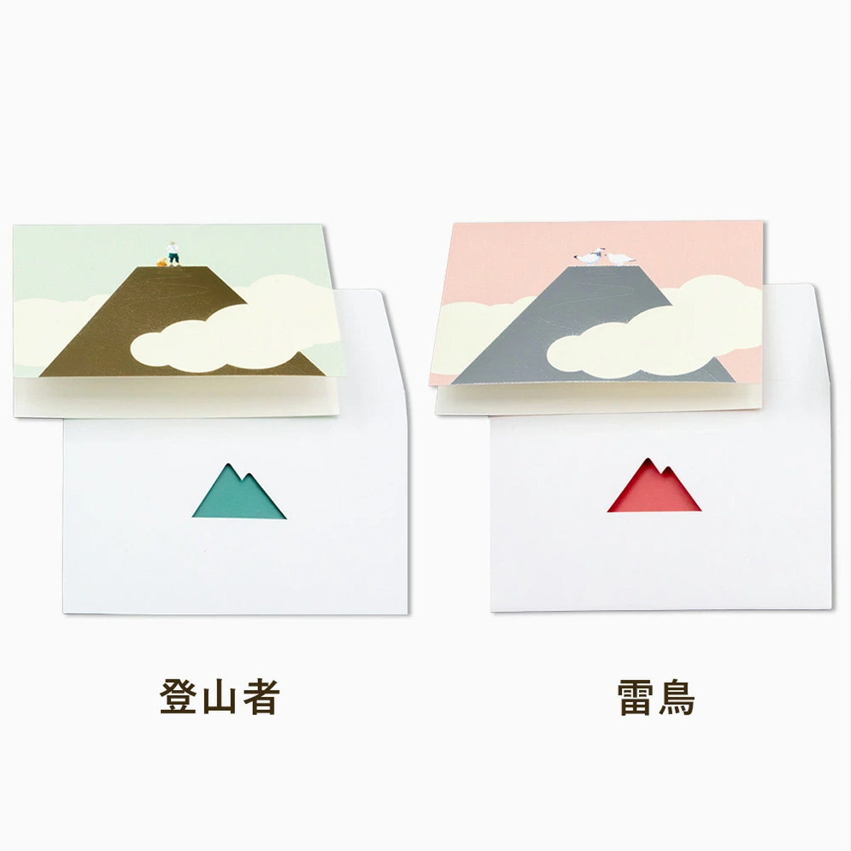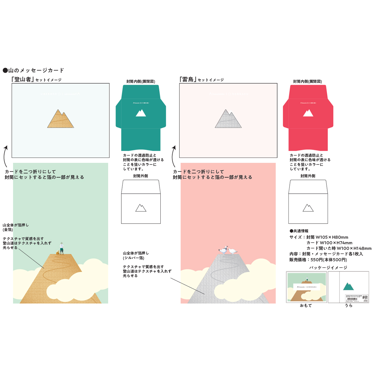 山の形に切り抜かれた封筒から見える、箔押しが目を引くデザインのメッセージカード。