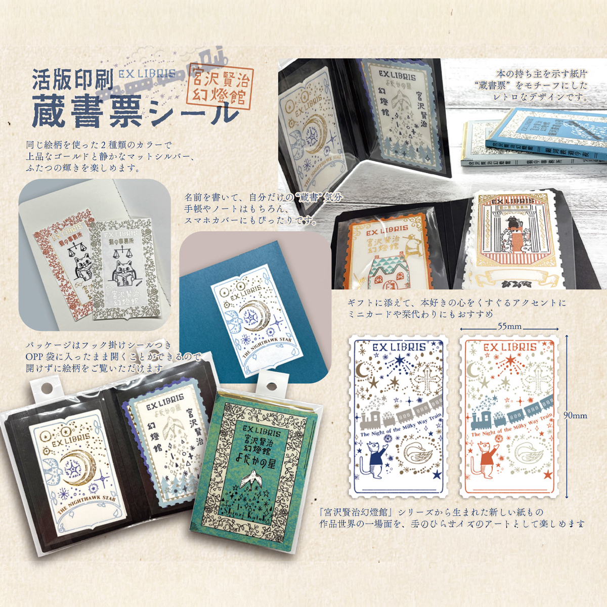 活版印刷のあたたかみと箔押しの輝きが調和した、宮沢賢治の幻想的な世界を描く蔵書票モチーフのシール。