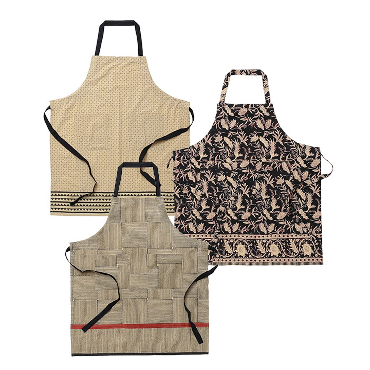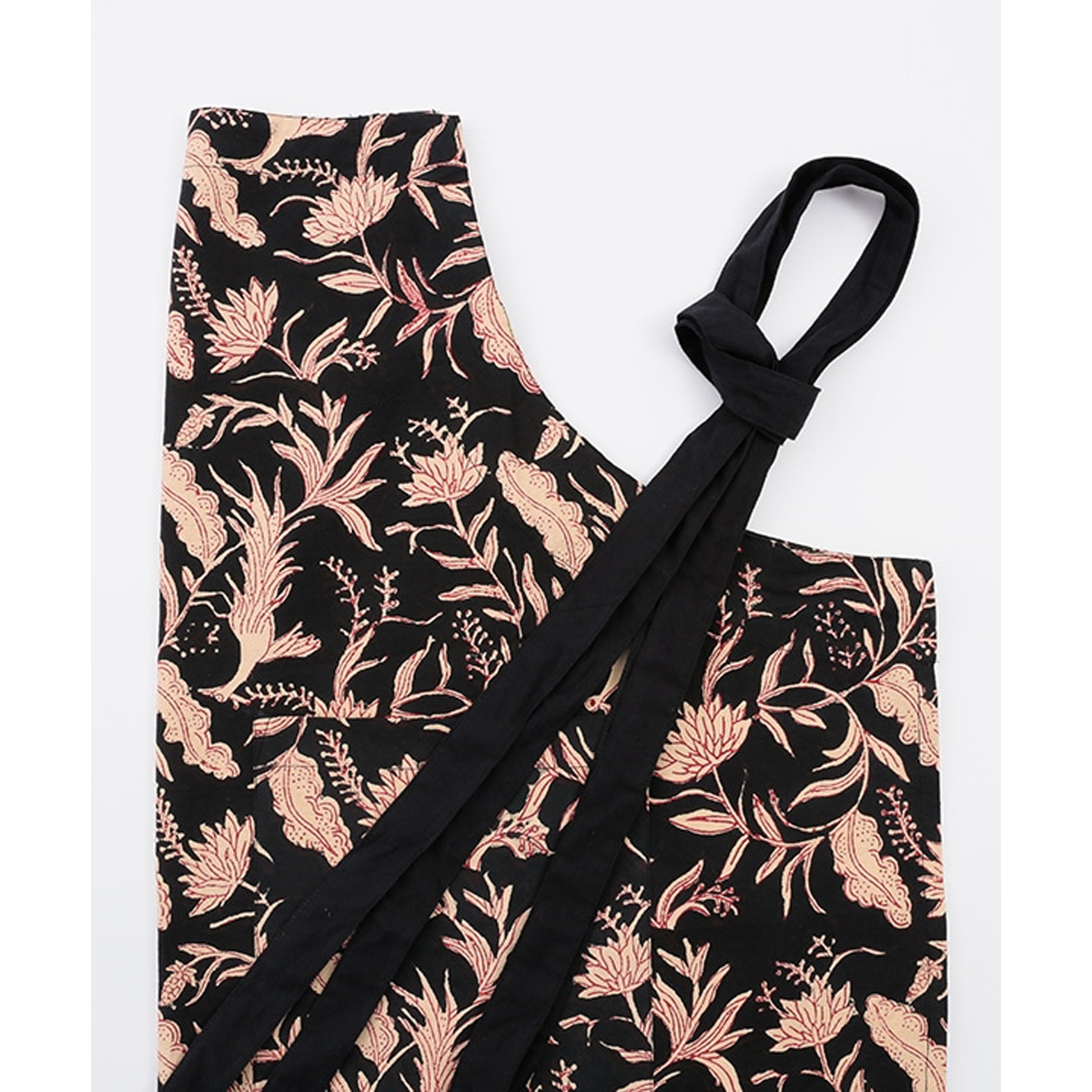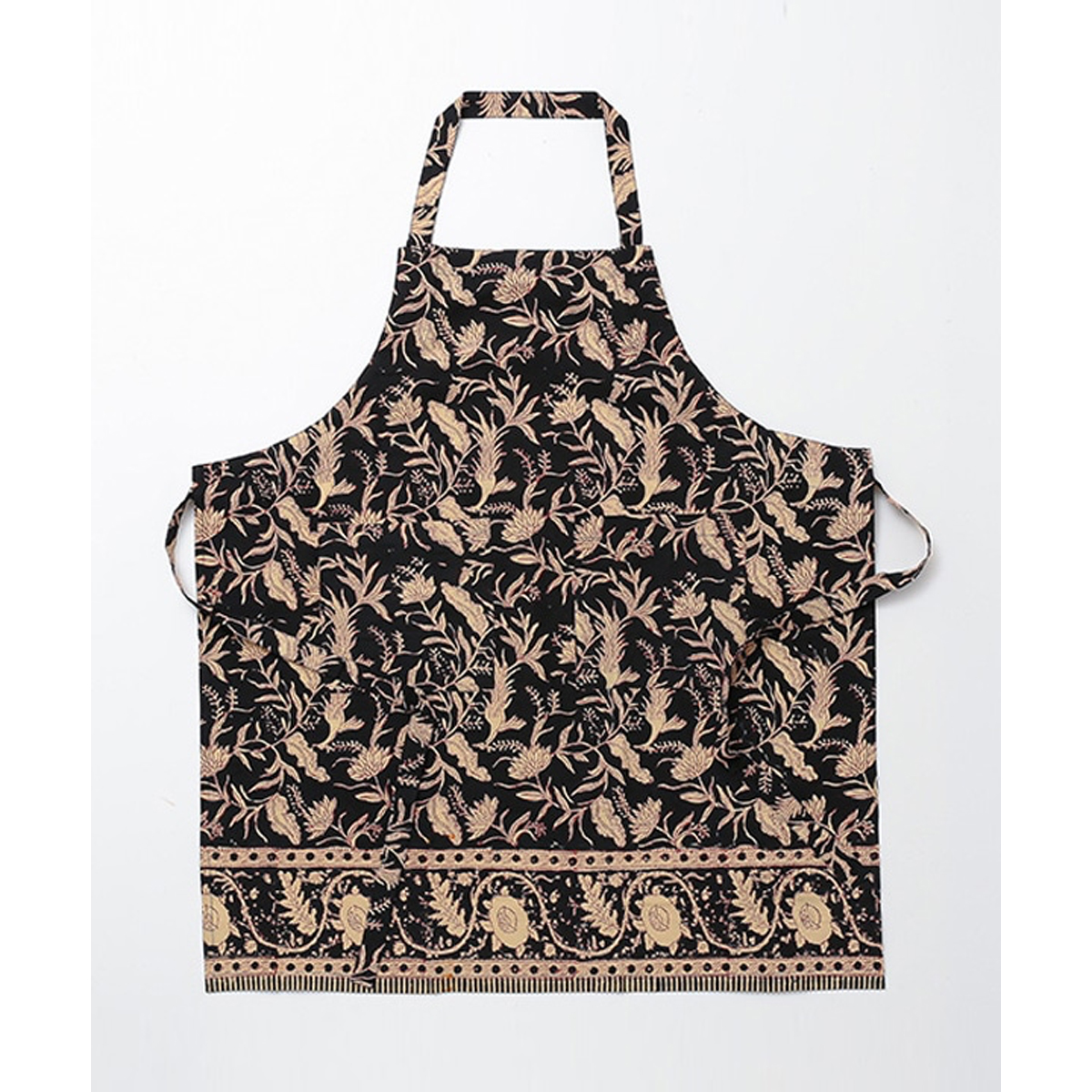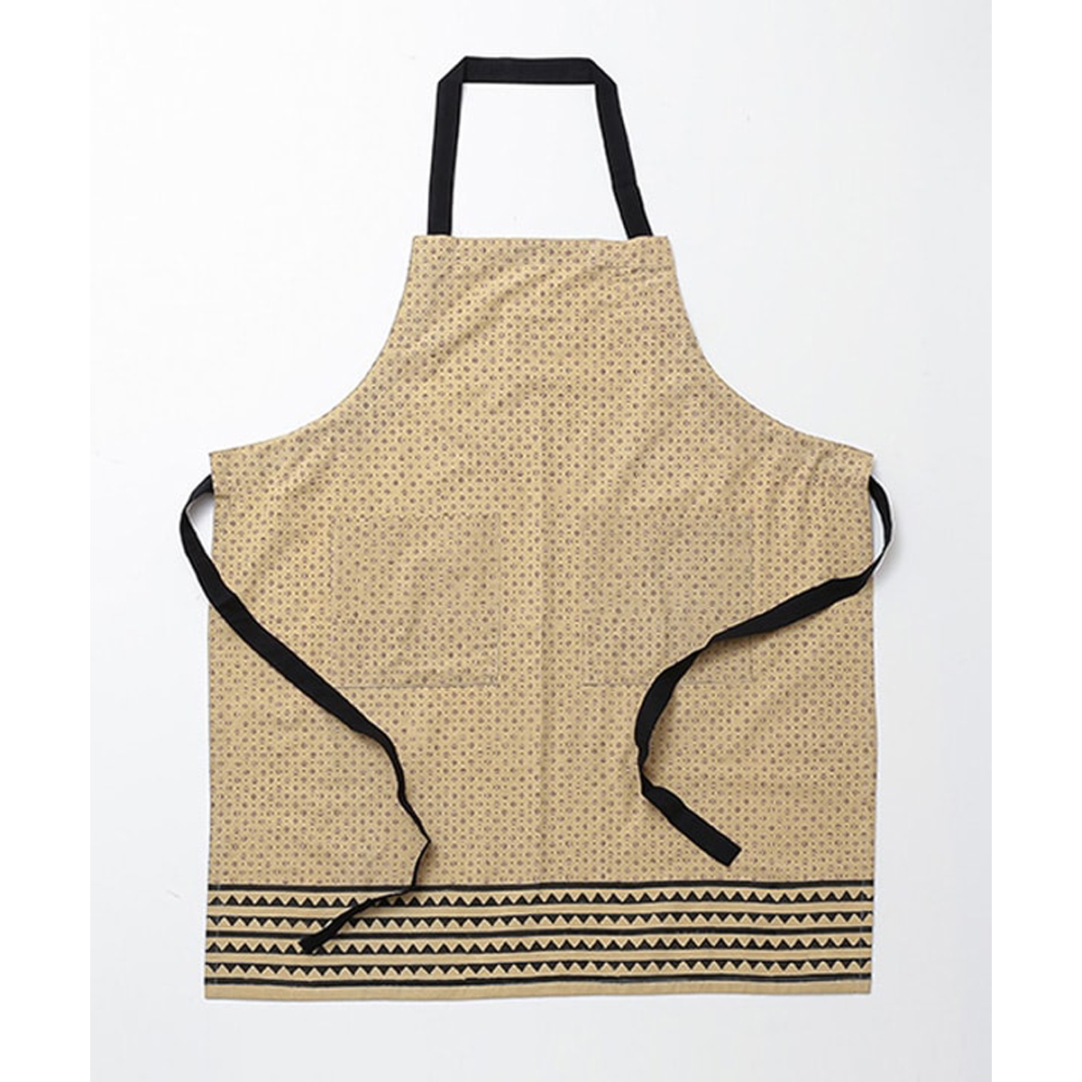 モダンな黒地に幾何学模様をあしらったシックなブロックプリントエプロン。日常のキッチンに落ち着いたアクセントを加え、長く愛されそうなデザインです。サイズは約90×80cmで、ゆったり作業しやすい仕様。家仕事にも喫茶店や料理教室のユニフォームにも映える一枚です。