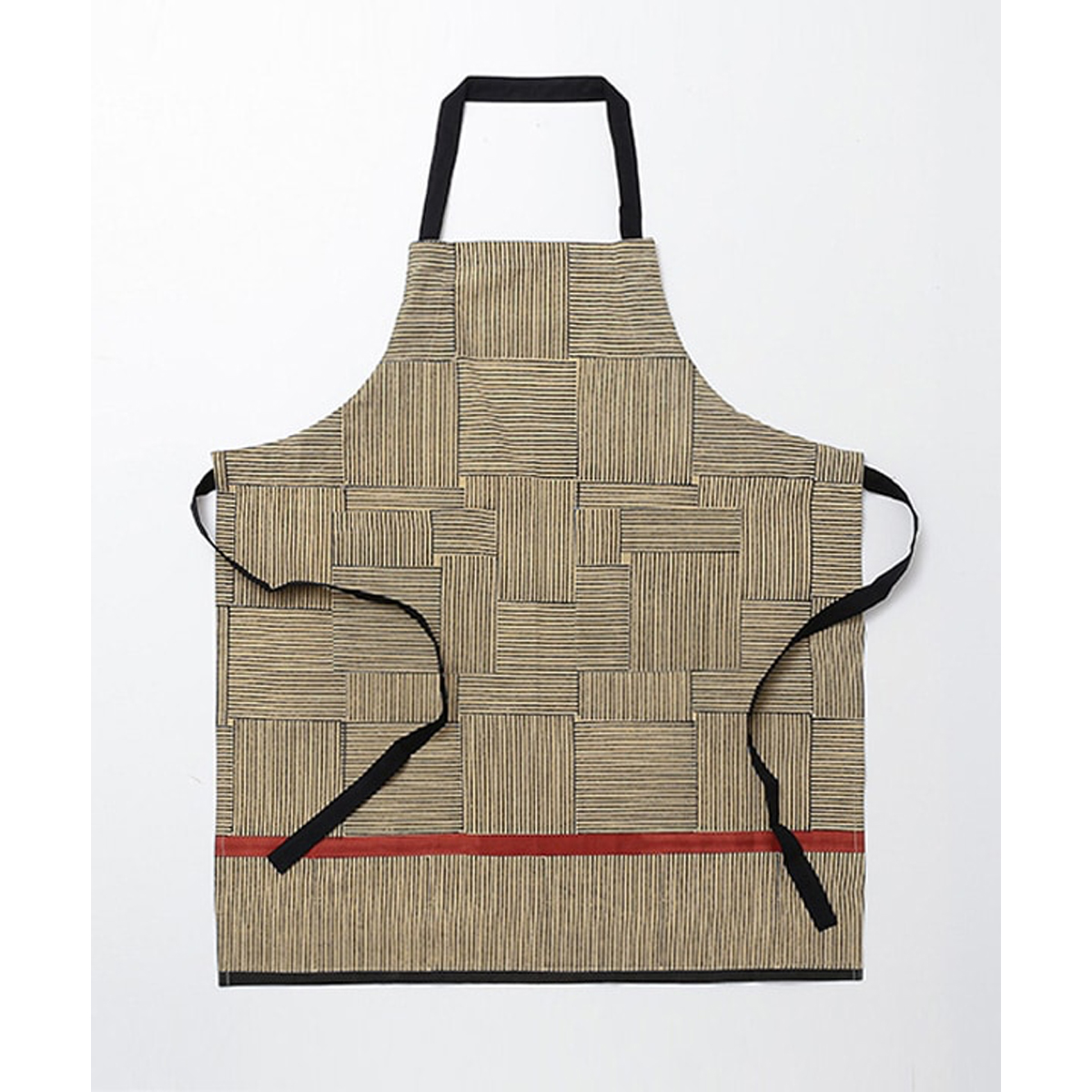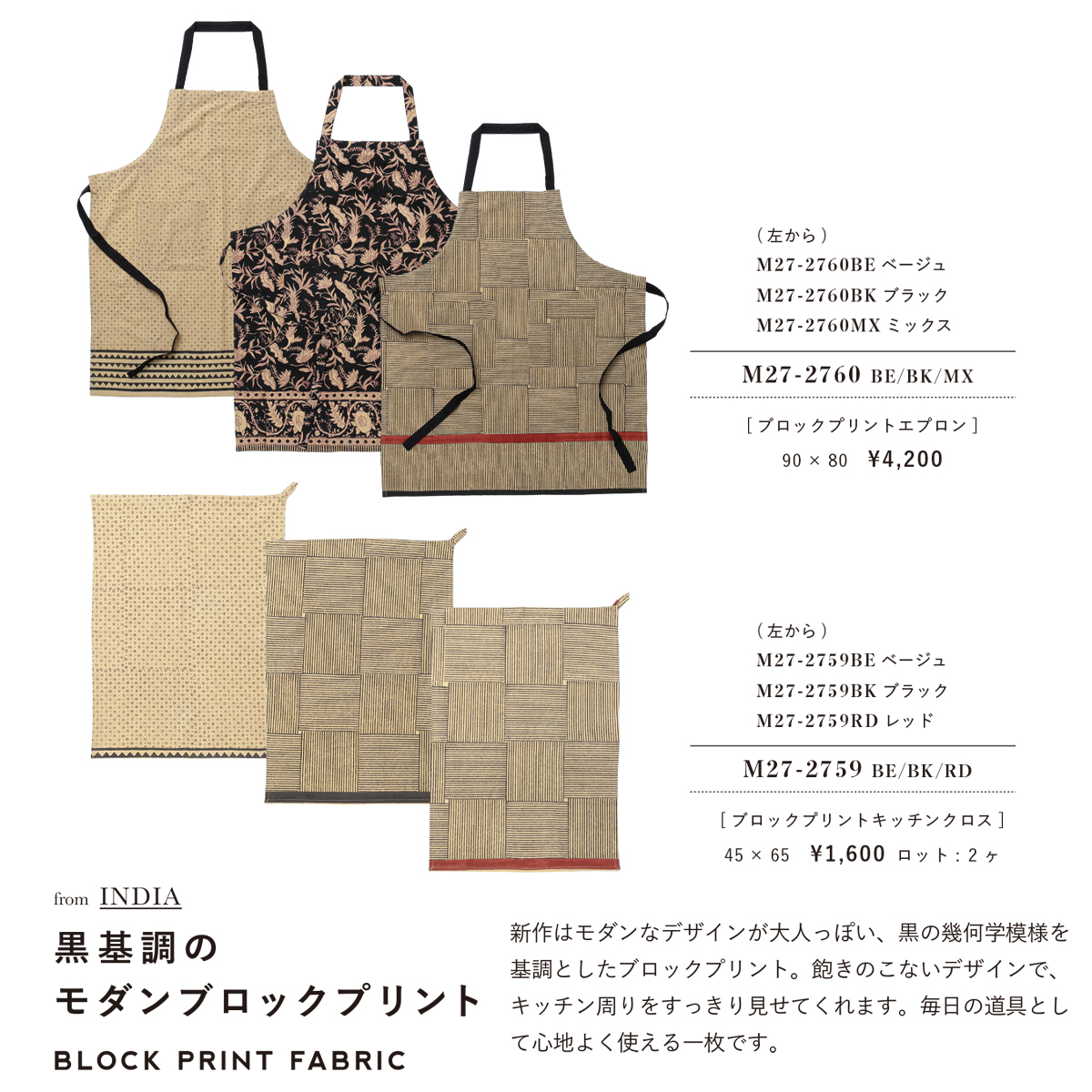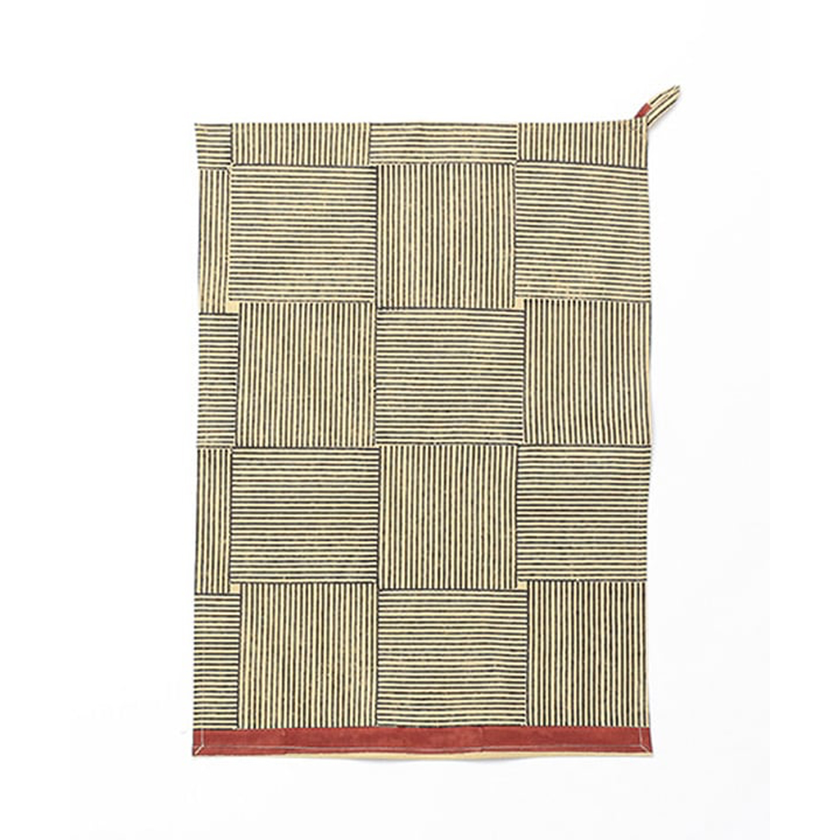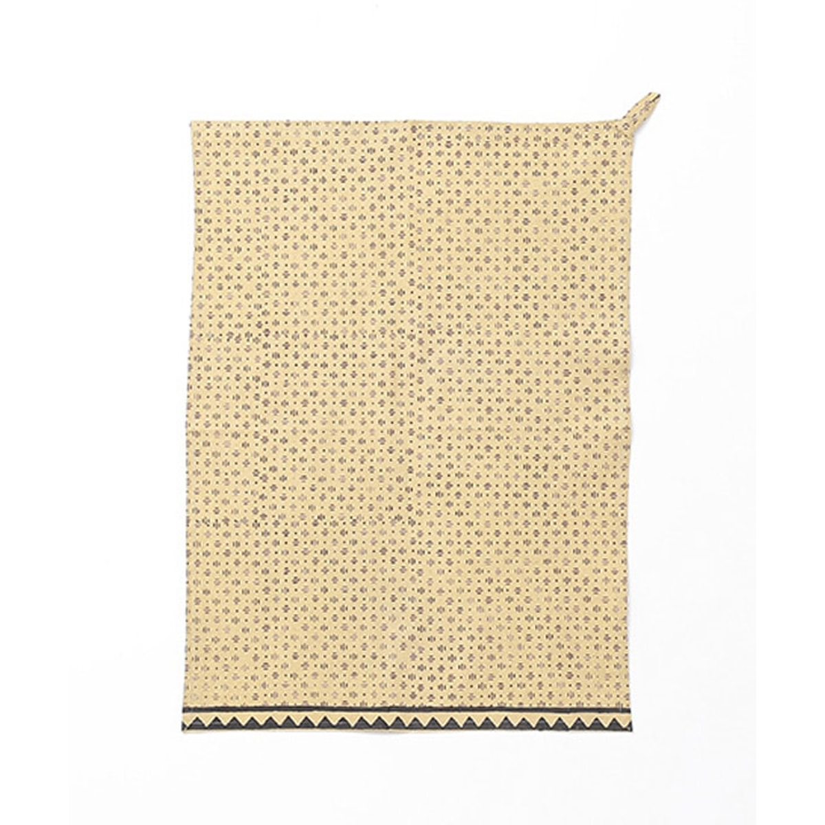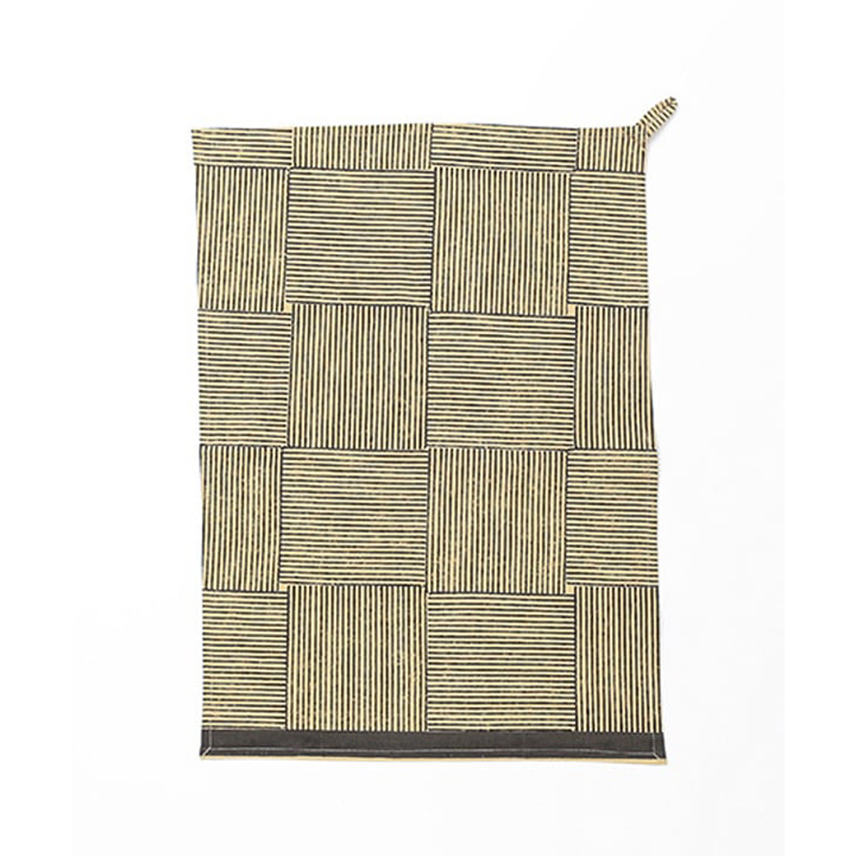 新作はモダンなデザインが大人っぽい、黒の幾何学模様を基調としたブロックプリント。飽きのこないデザインで、キッチン周りをすっきり見せてくれます。毎日の道具として心地よく使える一枚です。