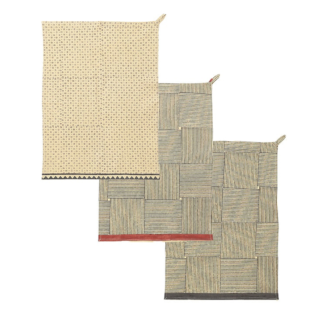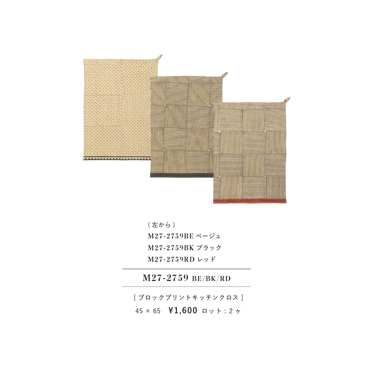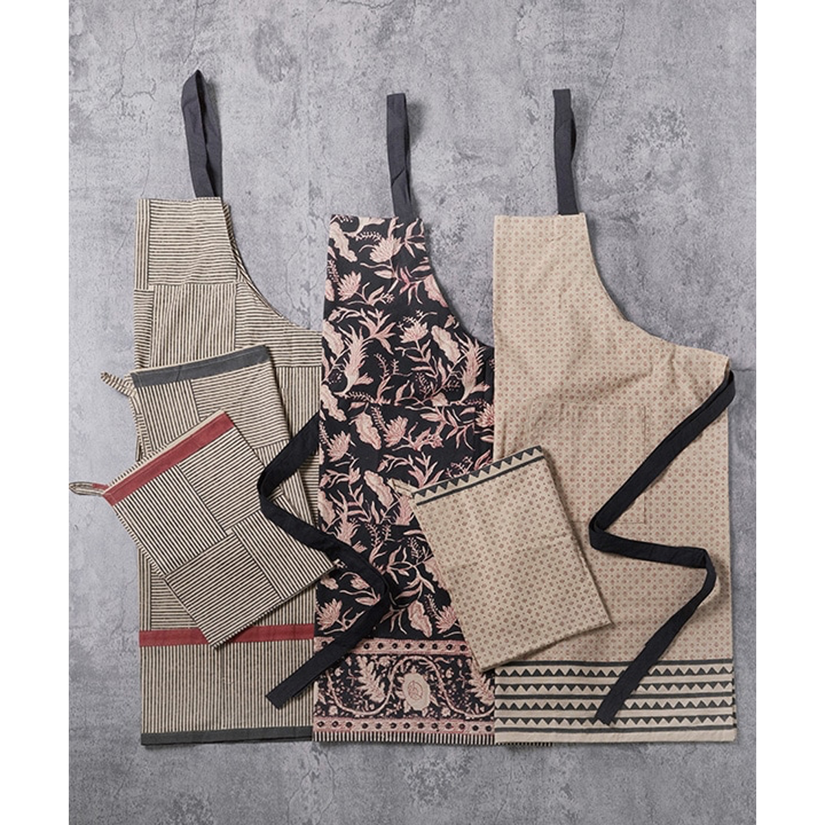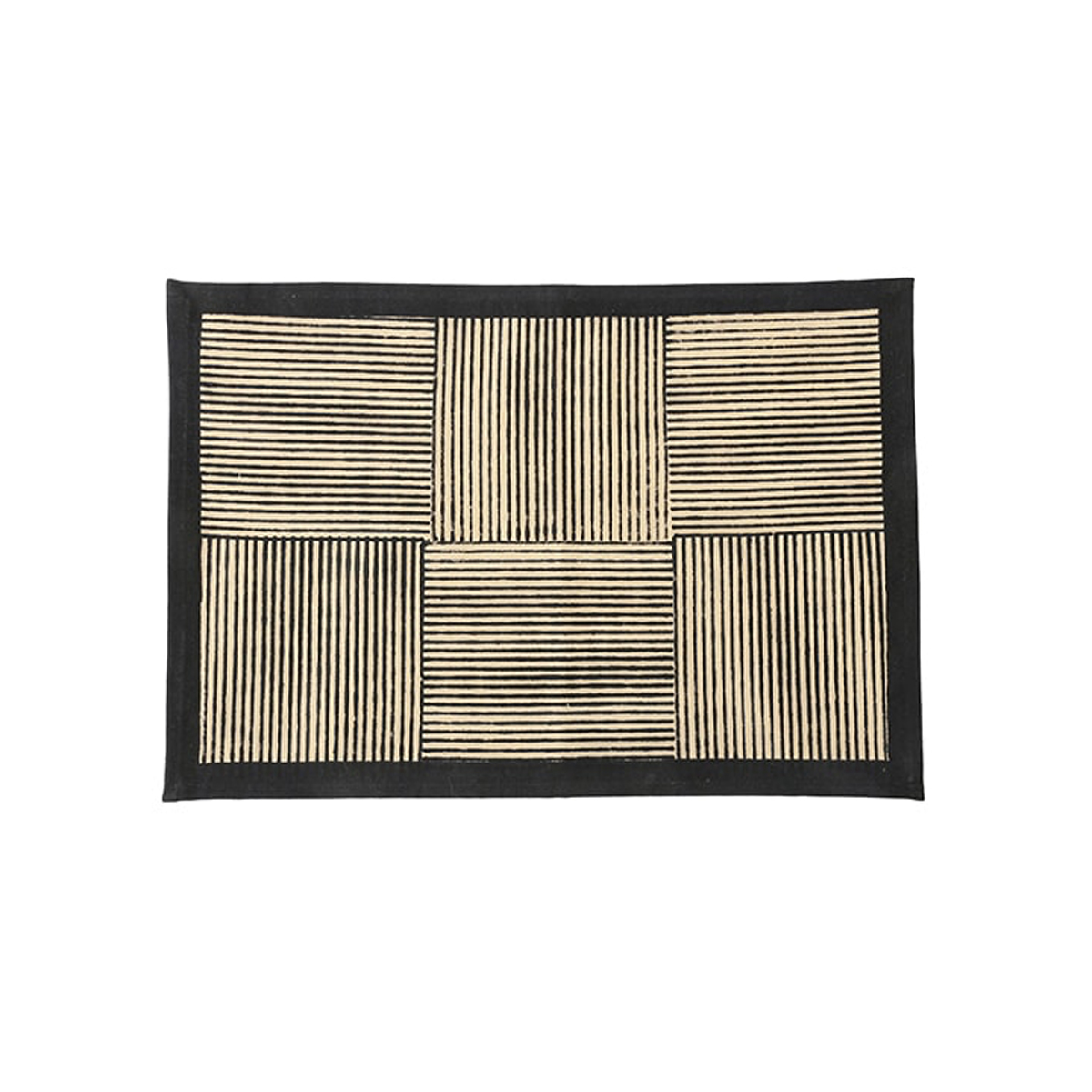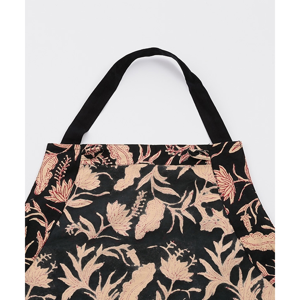 新作はモダンなデザインが大人っぽい、黒の幾何学模様を基調としたブロックプリント。飽きのこないデザインで、キッチン周りをすっきり見せてくれます。毎日の道具として心地よく使える一枚です。