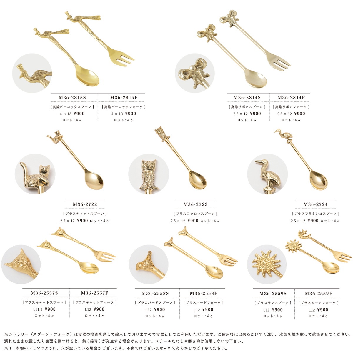 | サイズ | ピーコックスプーン:4 x 13 ピーコックフォーク:4 x 13 リボンスプーン:2.5 x 12 リボンフォーク:2.5 x 12 キャットスプーン:2.5 x 12 フクロウスプーン:2.5 x 12 フラミンゴスプーン:2.5 x 12 キャットスプーン:L11.5 キャットフォーク:L12 バードスプーン:L12 バードフォーク:L12 サンスプーン:L12 ムーンフォーク:L12 |