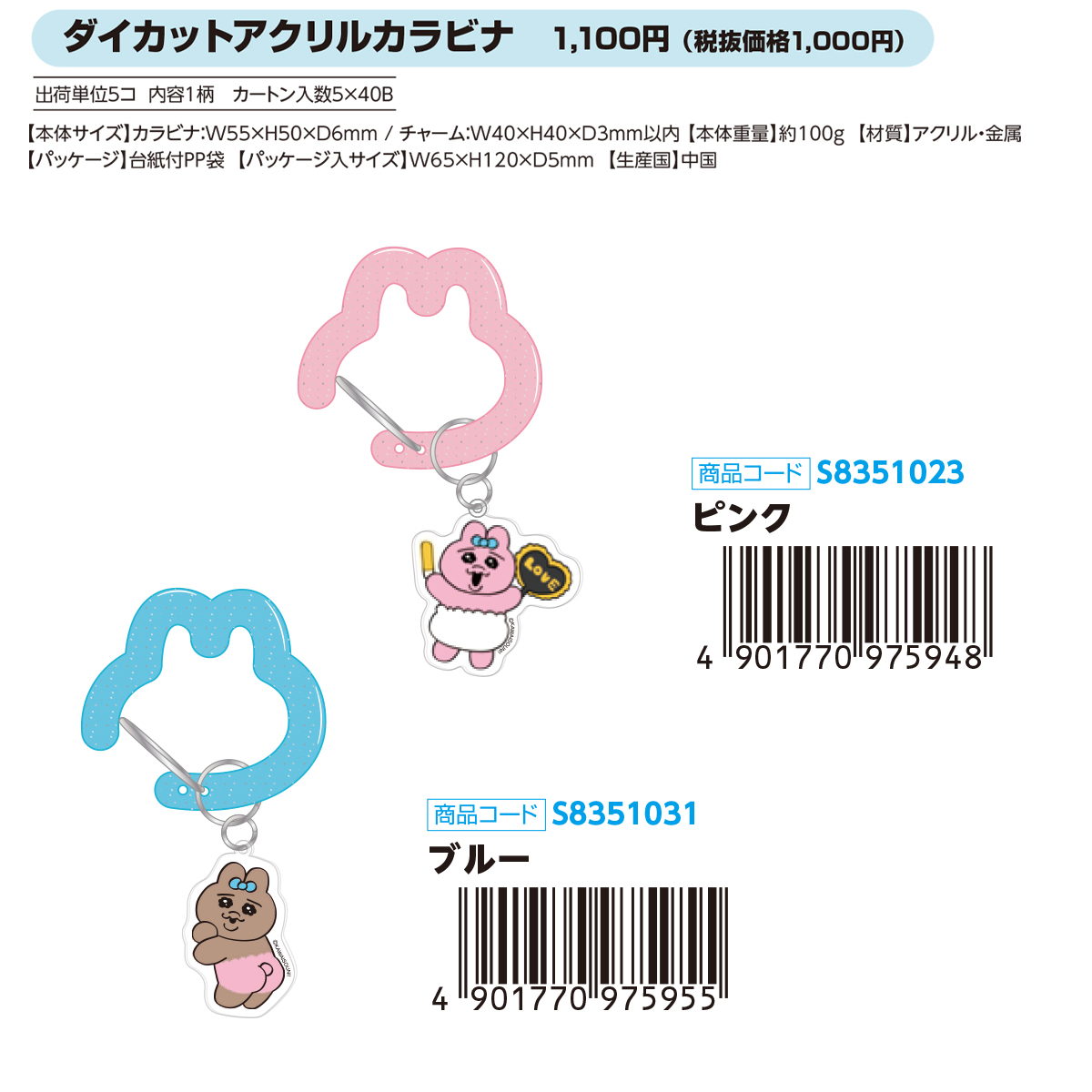 | サイズ | カラビナ:W55×H50×D6mm / チャーム:W40×H40×D3mm以内 約100g 【パッケージ入サイズ】W65×H120×D5mm |