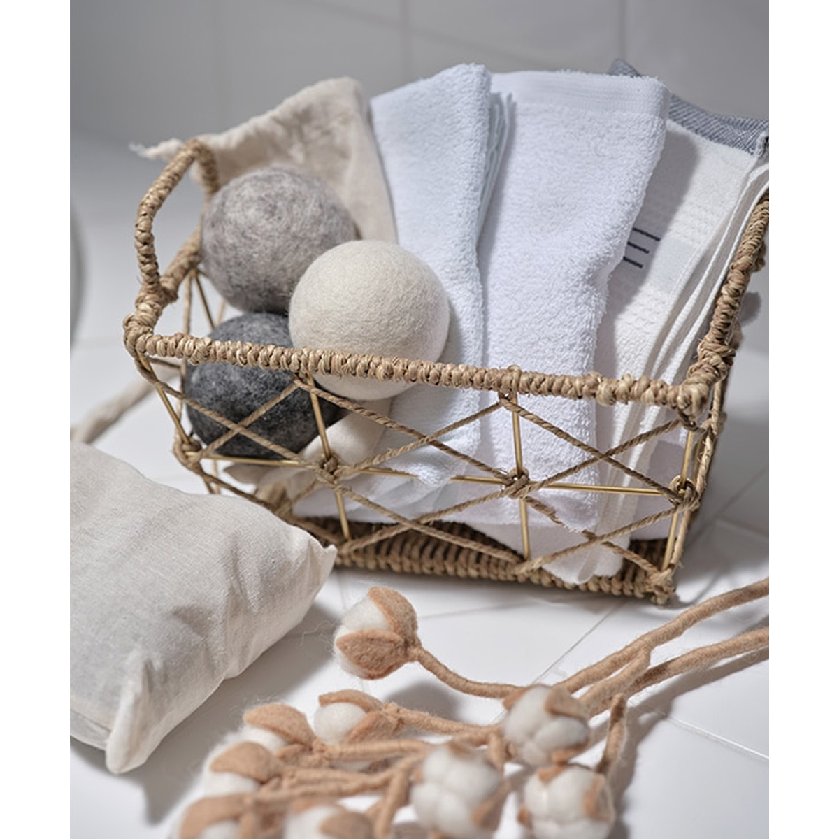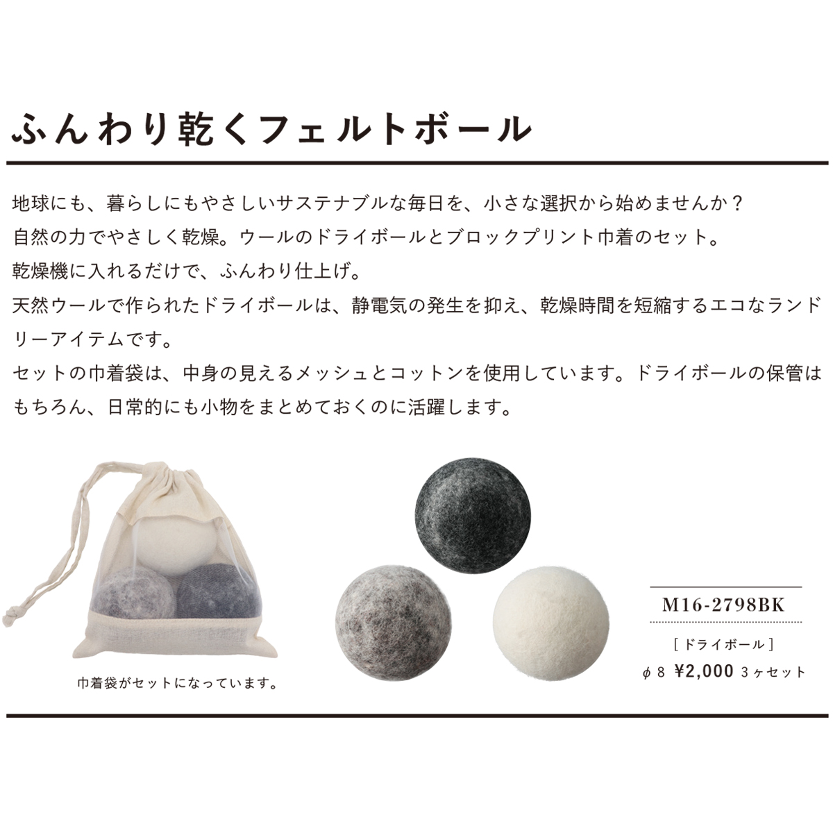 自然の力でやさしく乾燥。ウールのドライボールと巾着のセット。乾燥機に入れるだけで、ふんわり仕上げ。天然ウールで作られたドライボールは、静電気の発生を抑え、乾燥時間を短縮するエコなランドリーアイテムです。セットの巾着袋は、中身の見えるメッシュとコットンを使用しています。ドライボールの保管はもちろん、日常的にも小物をまとめておくのに活躍します。