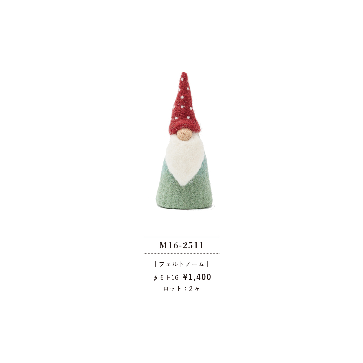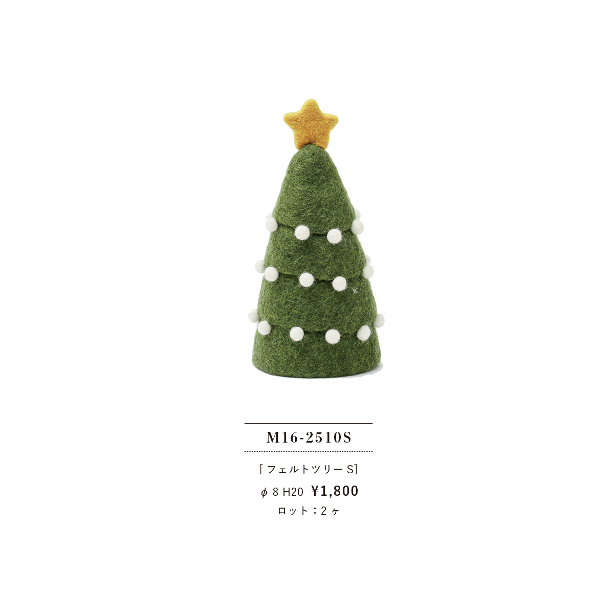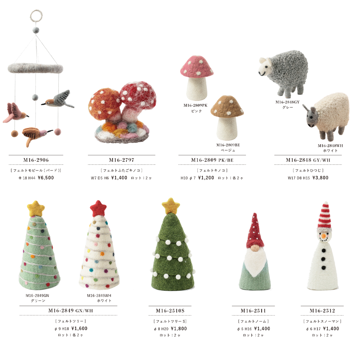 | サイズ | バード:Φ18 H44 フェルトふたごキノコ:W7 D5 H6 フェルトキノコ:H10 φ7 ひつじ:W17 D8 H15 フェルトツリー グリーン・ホワイト:φ9 H18 M16-2510Sフェルトツリー:Φ8 H20 フェルトノーム:Φ6 H16 フェルトスノーマン:Φ6 H17 |