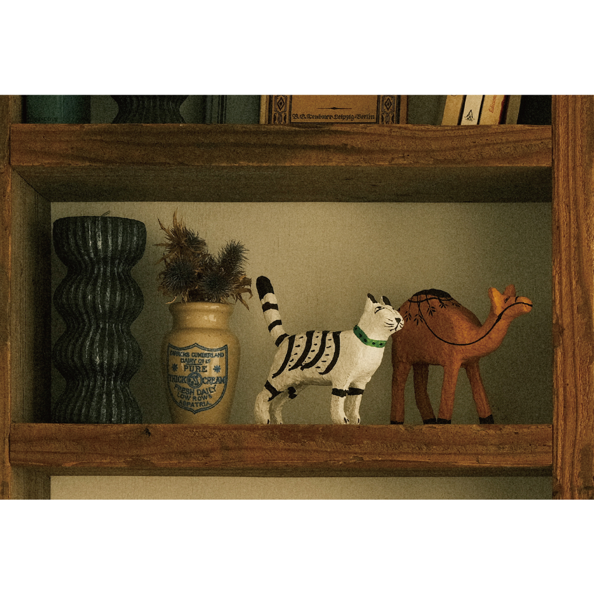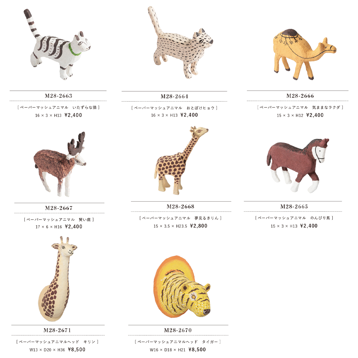| サイズ | いたずらな猫:16 x 3 H13 おとぼけヒョウ:16 x 3 H13 気ままなラクダ:15 x 3 H12 賢い鹿:17 x 6 H16 夢見るきりん:15 x 3.5 H23.5 のんびり馬:15 x 3 H13 キリン:W13 D20 H36 タイガー:W16 D18 H21 |