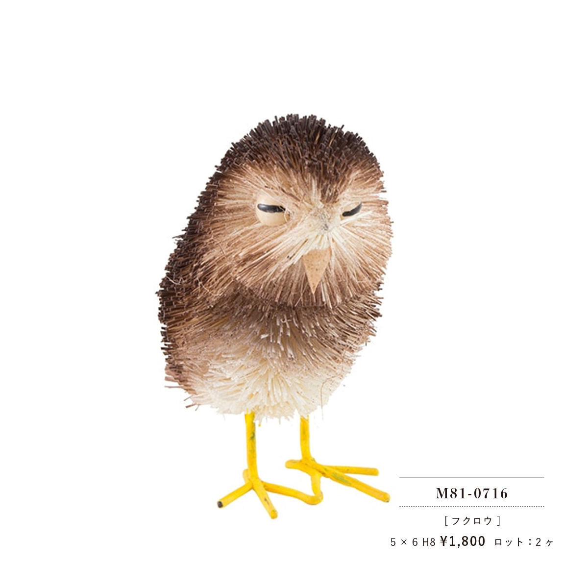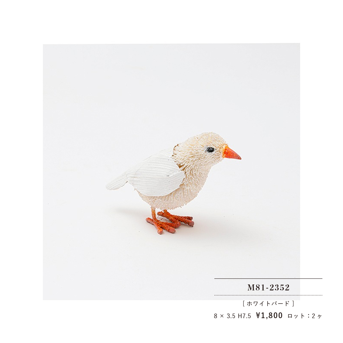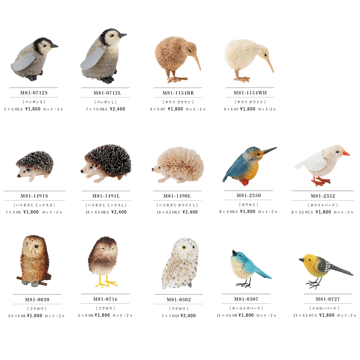 | サイズ | ペンギンS:5 x 5 H6.5 ペンギンL:7 x 7.5 H8.5 キウイ(ブラウン):9 x 5 H7 キウイ(ホワイト):9 x 5 H7 ハリネズミ(ミックス)S:7 x 5 H5 ハリネズミ(ミックス)L:10 x 6.5 H6.5 ハリネズミ(ホワイト)L:10 x 6.5 H6.5 カワセミ:8 x 4 H6.5 ホワイトバード:8 x 3.5 H7.5 M81-0030フクロウ:5.5 x 5 H8 M81-0716フクロウ:5 x 6 H8 M81-0302フクロウ:7 x 7 H10 ターコイズバード:11 x 4.5 H8 イエローバード:11 x 4.5 H7.5 |