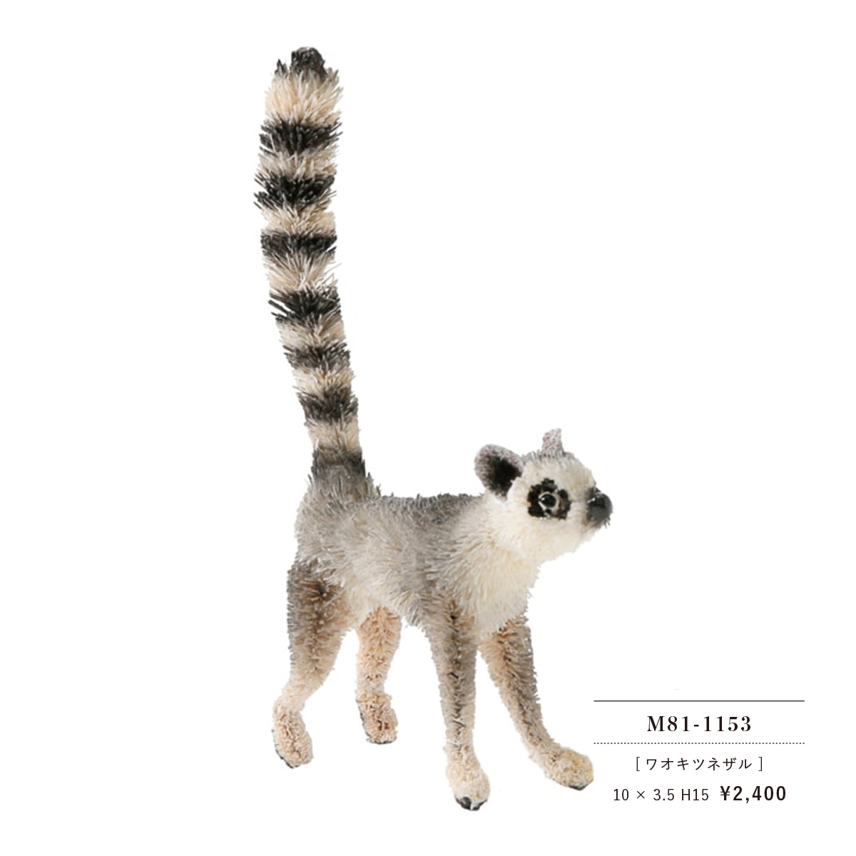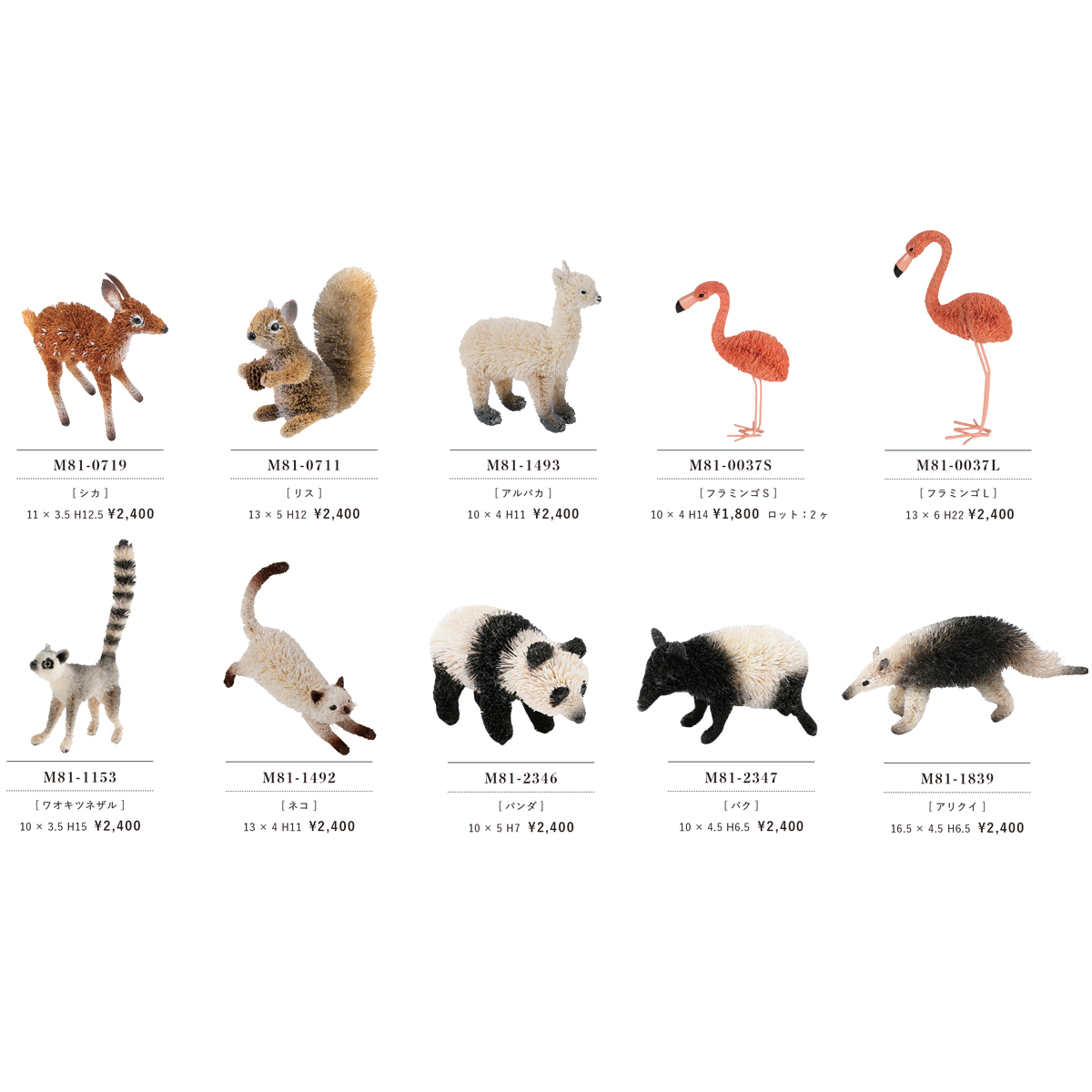 | サイズ | シカ:11 x 3.5 H12.5 リス:13 x 5 H12 アルパカ:10 x 4 H11 フラミンゴ:10 x 4 H14 フラミンゴ:13 x 6 H22 ワオキツネザル:10 x 3.5 H15 ネコ:13 x 4 H11 パンダ:10 X 5 H7 バク:10 x 4.5 H6.5 アリクイ:16.5 x 4.5 H6.5 |