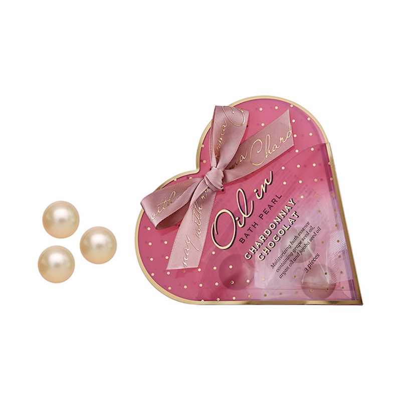 ハート型のパッケージが目を引く、まるでパールのような保湿オイル入り入浴料が3粒入ったギフトセット。