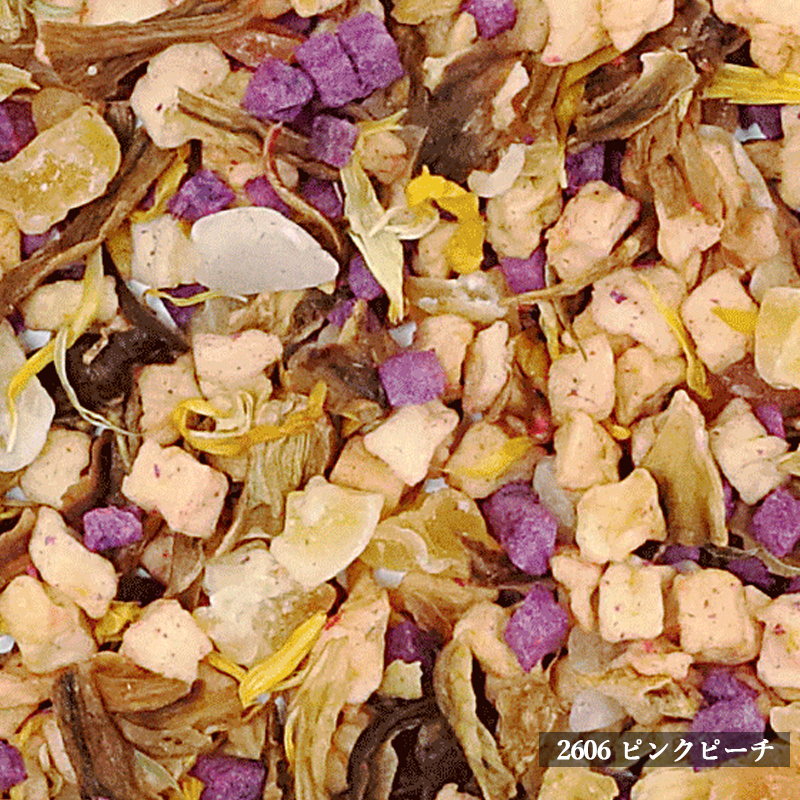 2606 ピンクピーチ:パパイヤビッツ(パパイヤ、砂糖)、紫芋、アップル、ホワイトハイビスカス、ローズヒップシード、マリーゴールド、ピーチビッツ(ピーチ、砂糖)/香料