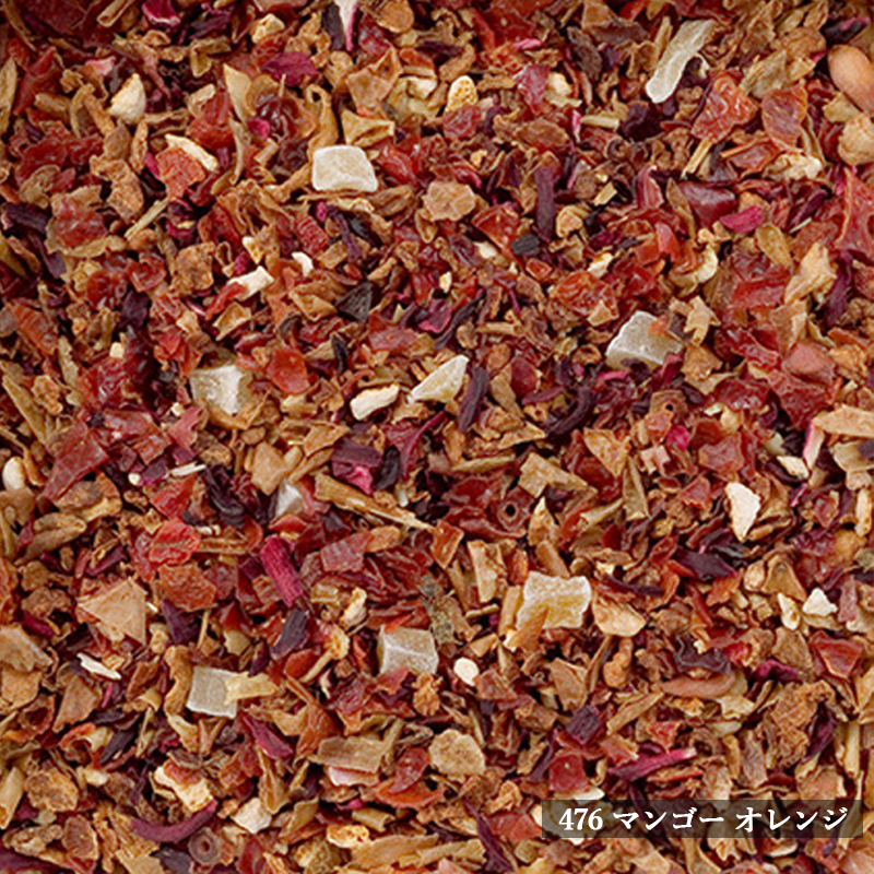 476 マンゴー オレンジ:アップル、ローズヒップ、ハイビスカス、オレンジピール、マンゴービッツ(マンゴー、砂糖)、レモンピール/香料、クエン酸