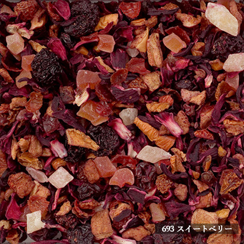693 スイートベリー:ハイビスカス、アップル、ローズヒップ、パパイヤビッツ(パパイヤ、砂糖)、パイナップルビッツ(パイナップル、砂糖)、グレープ、チェリー、ラズベリー/香料、クエン酸