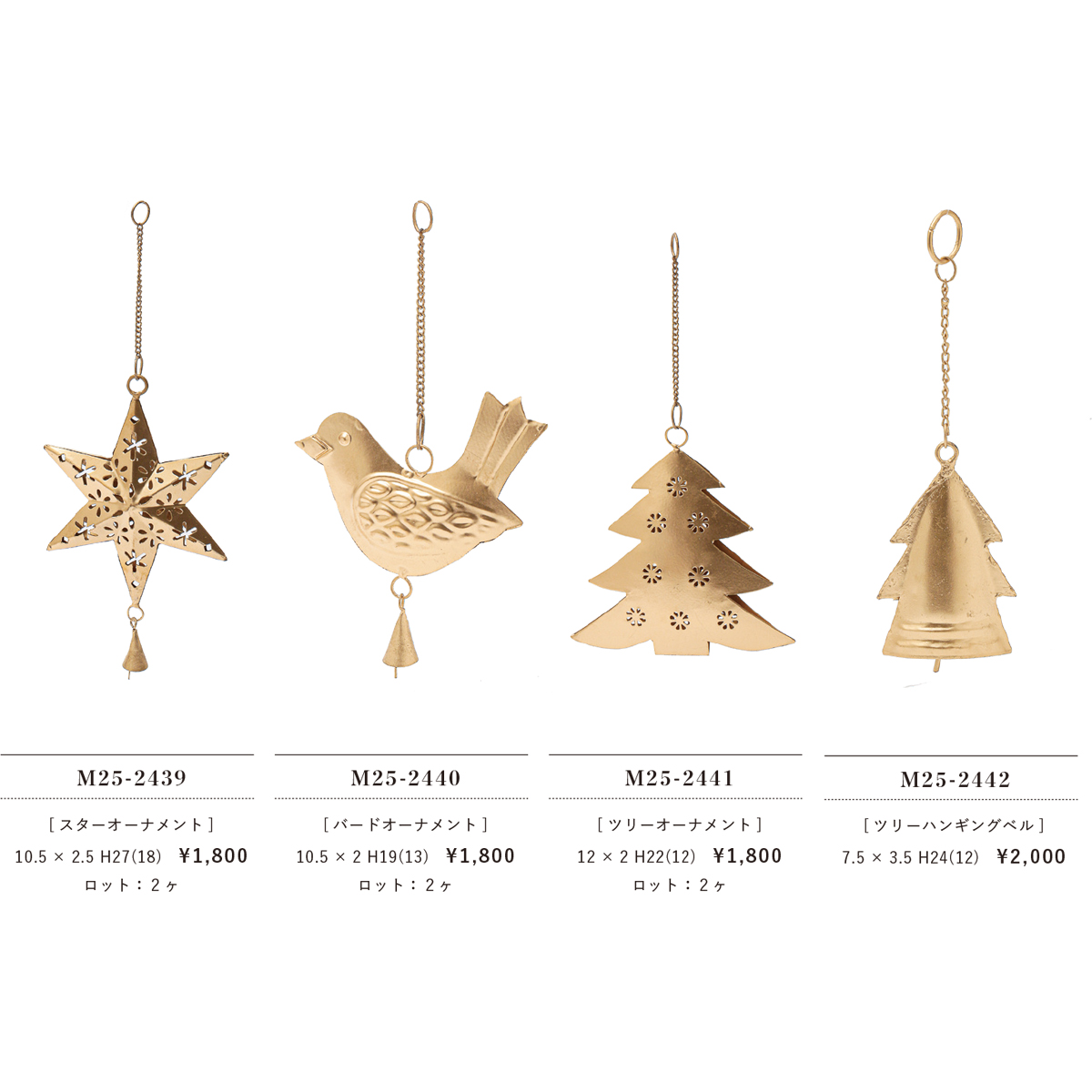 | サイズ | スターオーナメント:W10.5 D2.5 H27(18) バードオーナメント:W10.5 D2 H19(13) ツリーオーナメント:W12 D2 H22(12) ツリーハンギングベル:W7.5 D3.5 H24(12) |