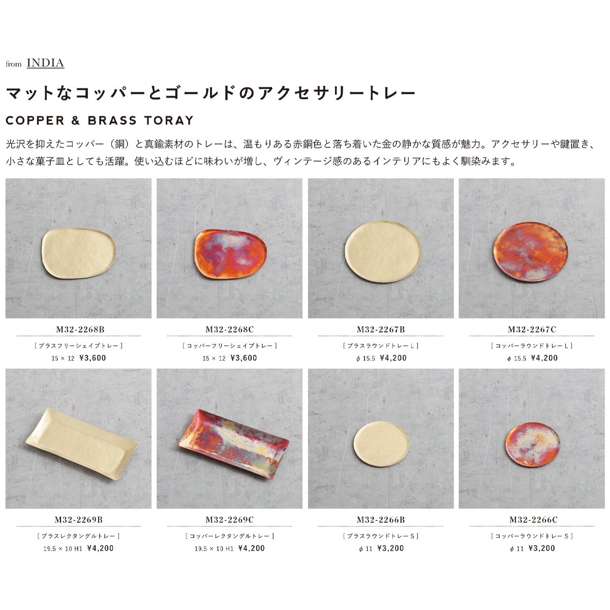 | サイズ | ブラスフリーシェイプトレー:15 x 12 コッパーフリーシェイプトレー:15 x 12 ブラスラウンドトレー:Φ15.5 コッパーラウンドトレー:Φ15.5 ブラスレクタングルトレー:19.5 x 10 H1 コッパーレクタングルトレー:19.5 x 10 H1 ブラスラウンドトレー:Φ11 コッパーラウンドトレー:Φ11 |