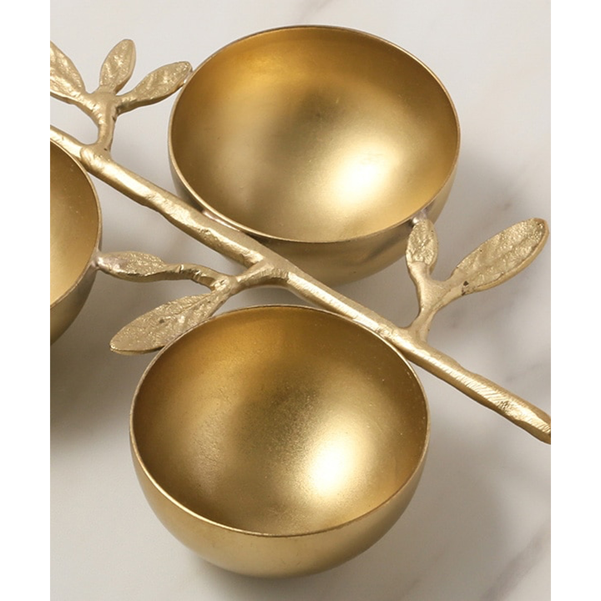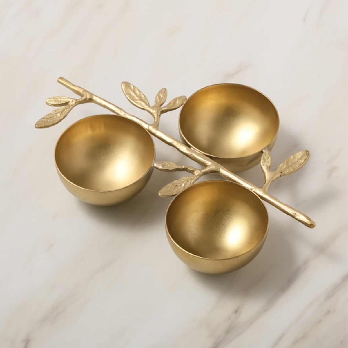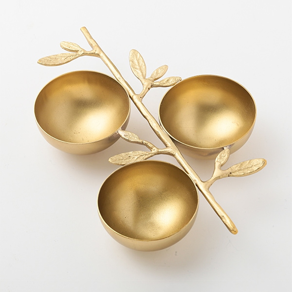 マットなゴールドが高級感のある、葉と木の枝モチーフの3連ボウルです。