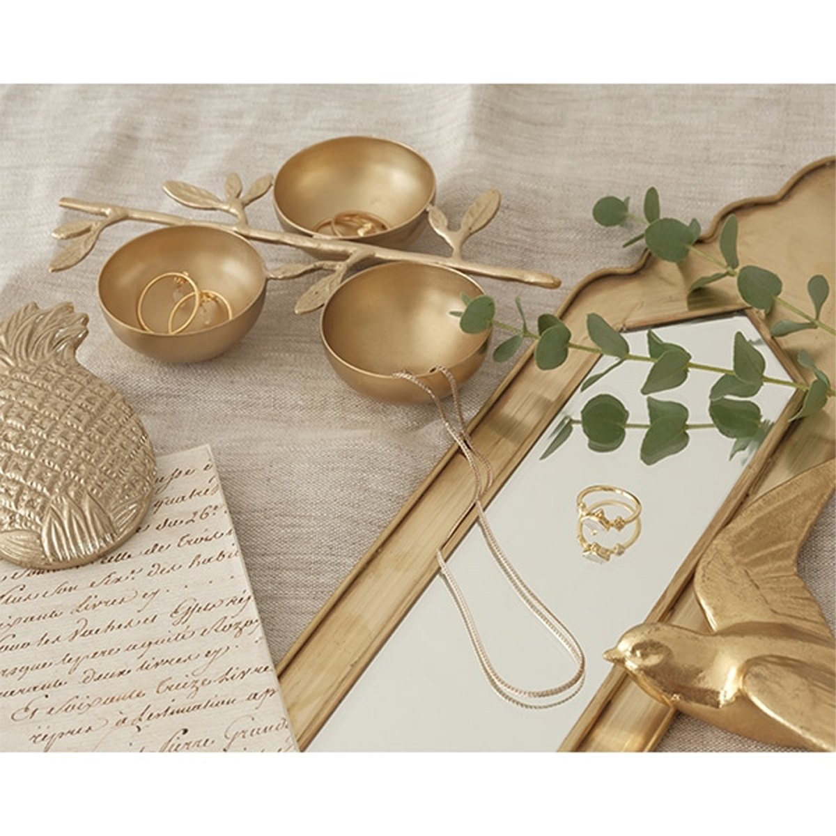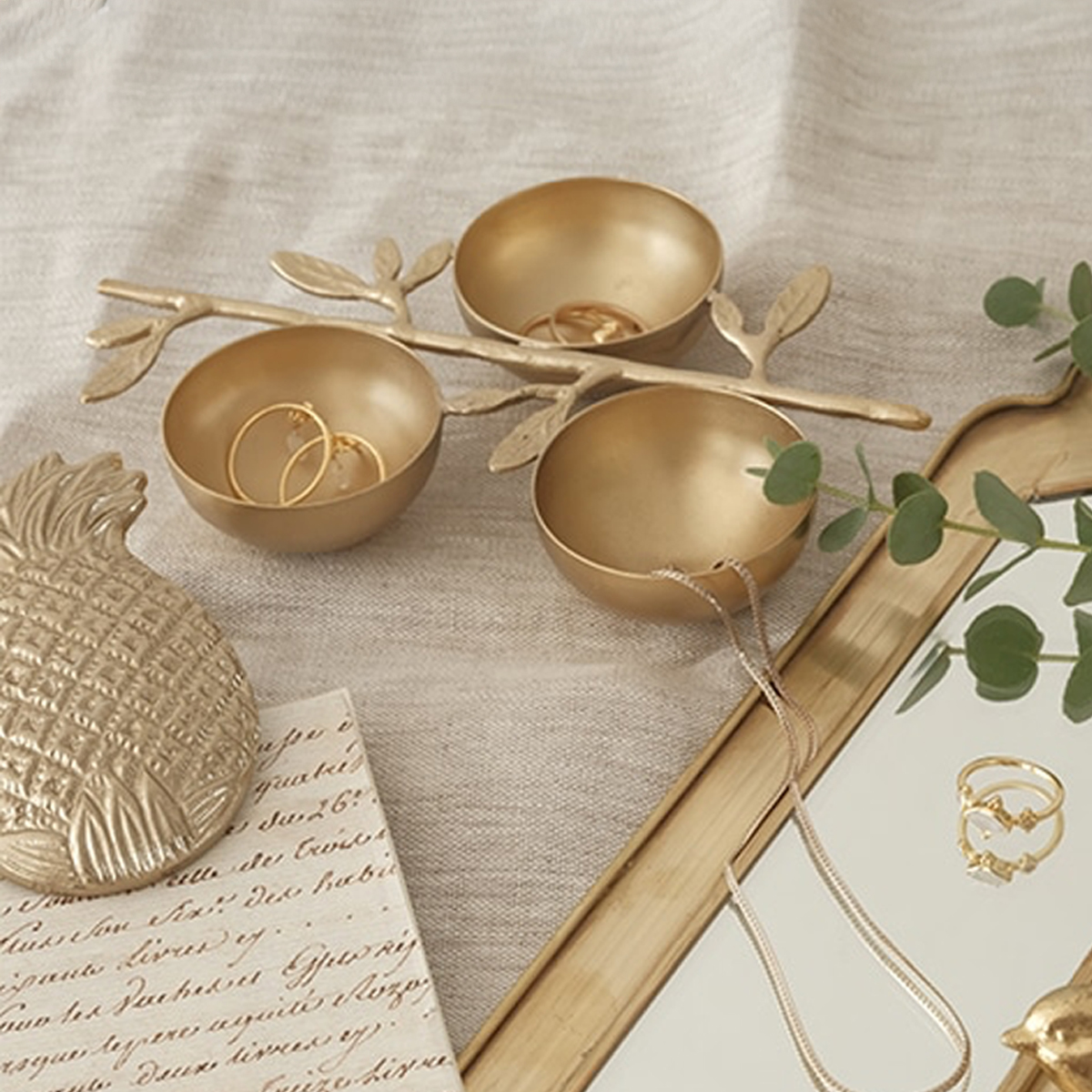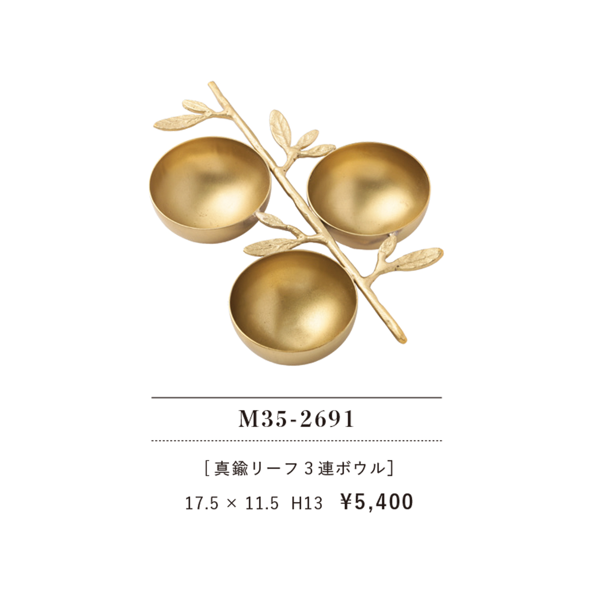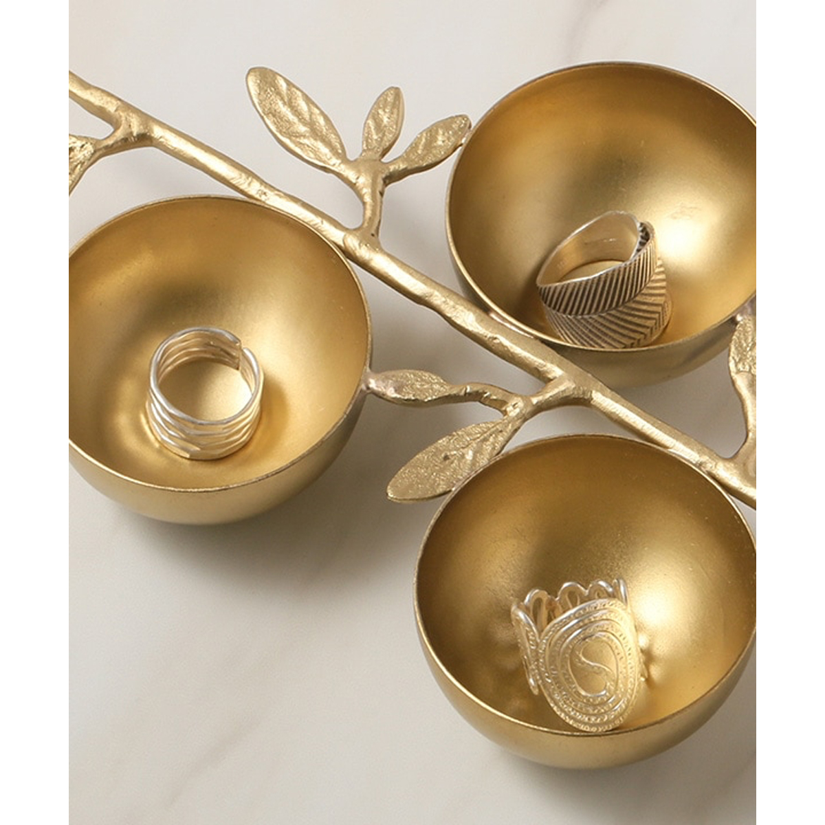 マットなゴールドが高級感のある、葉と木の枝モチーフの3連ボウルです。
