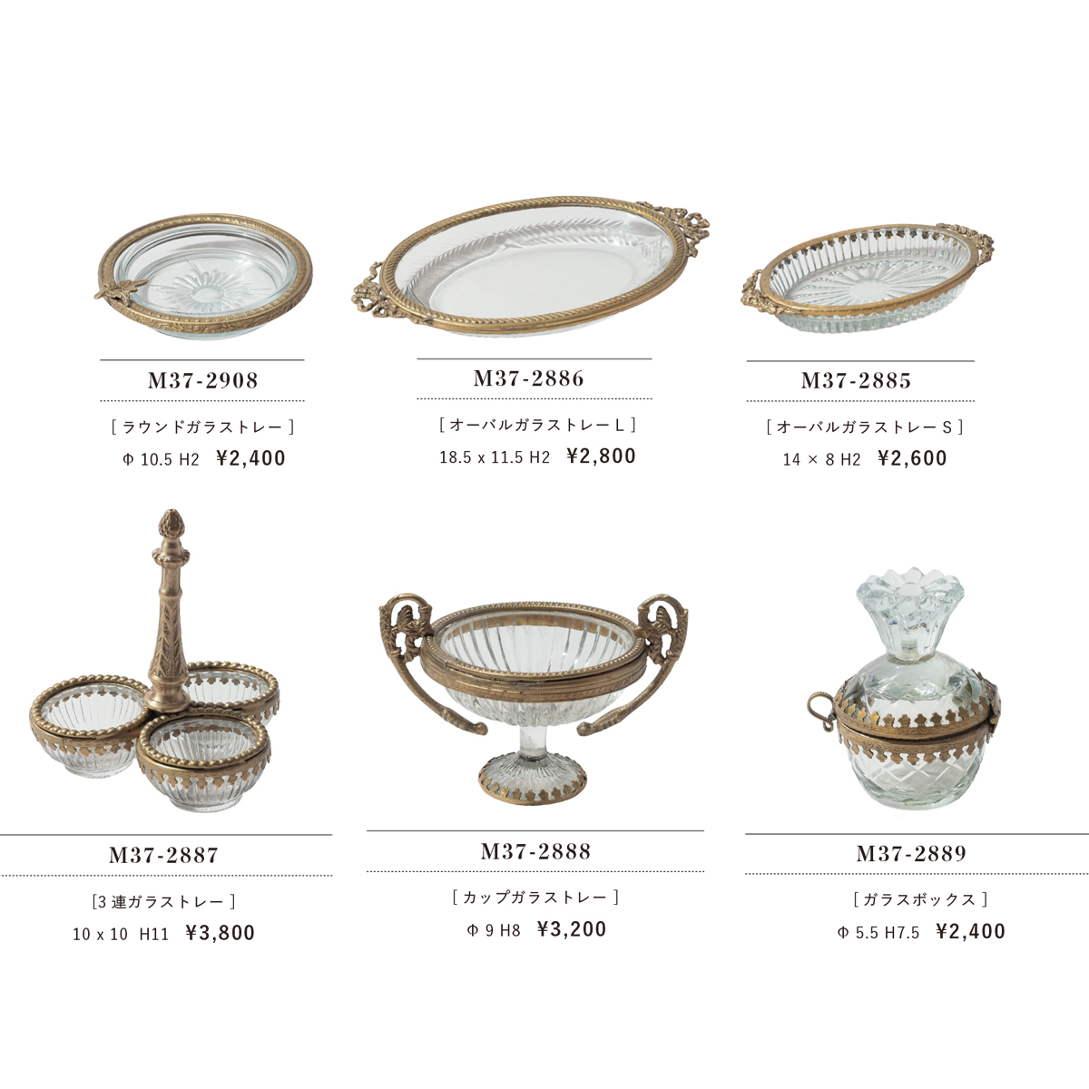 | サイズ | ラウンドガラストレー:Φ10.5 H2 オーバルガラストレーL:18.5 x 11.5 H2 オーバルガラストレーS:14 x 8 H2 3連ガラストレー:10 x 10 H11 カップガラストレー:Φ9 H8 ガラスボックス:Φ5.5 H7.5 ガラスキャニスター:Φ14 H12 |
