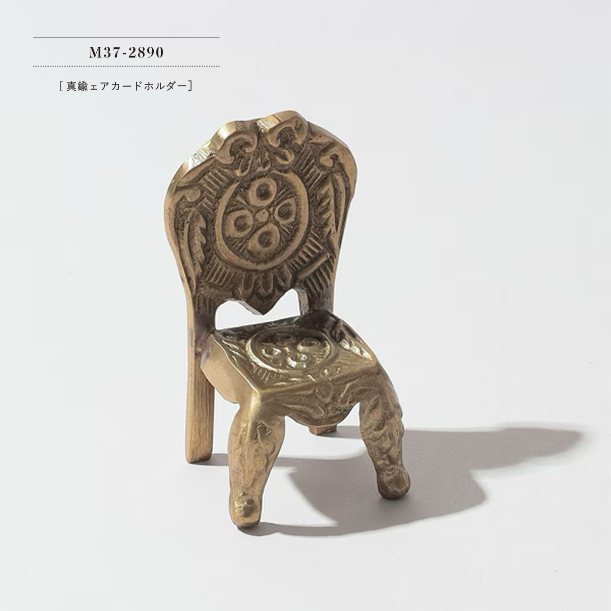 インド製の真鍮素材を用いた、ハート型ではなく椅子(チェア)モチーフのカードスタンド「ゴールド チェアカードホルダー」です。どこかクラシカルで優雅な印象のある椅子フォルムが、さりげない存在感を放ちながら、名刺やポストカード、小さな写真などを美しく立て掛けることができます。