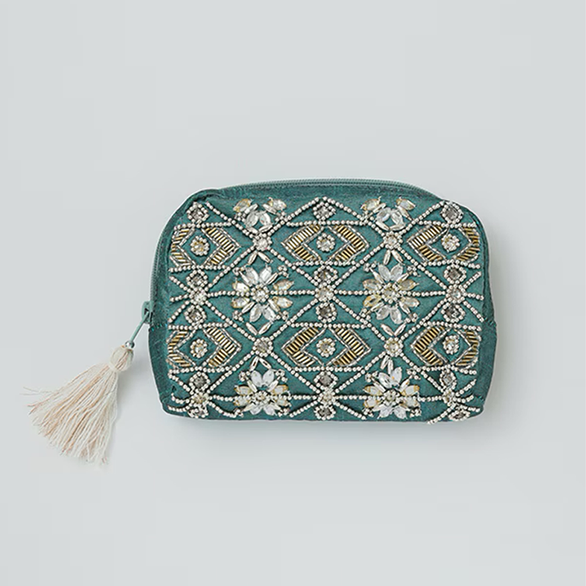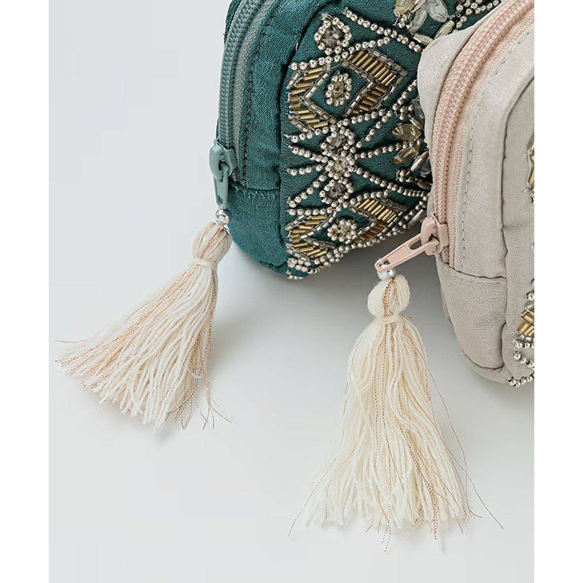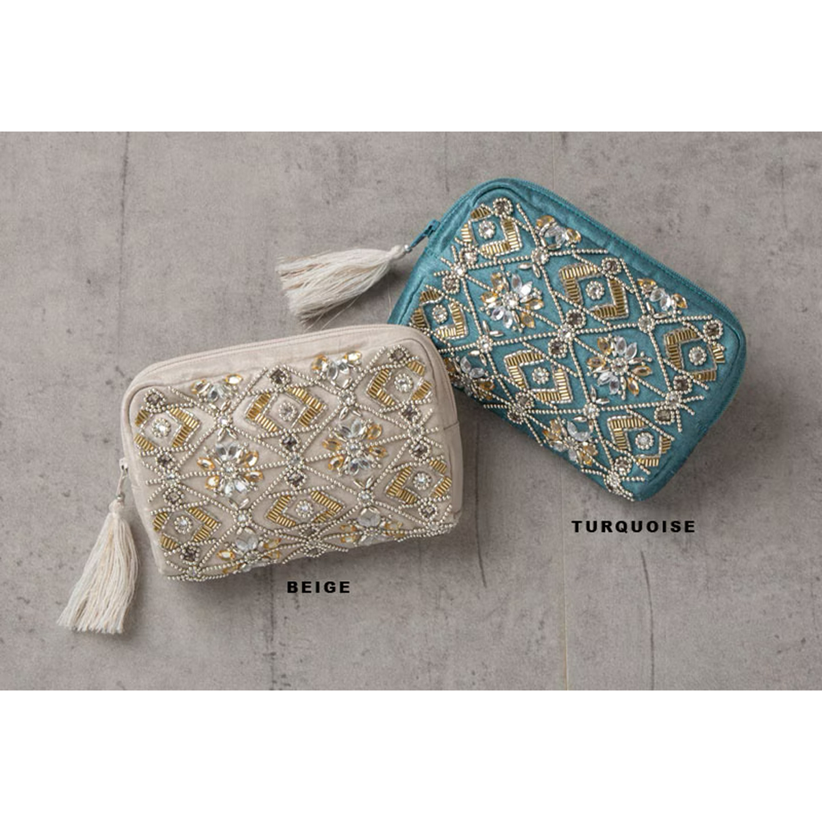 色鮮やかなビーズ刺繍やミラー刺繍が施された、華やかさあふれるポーチです。