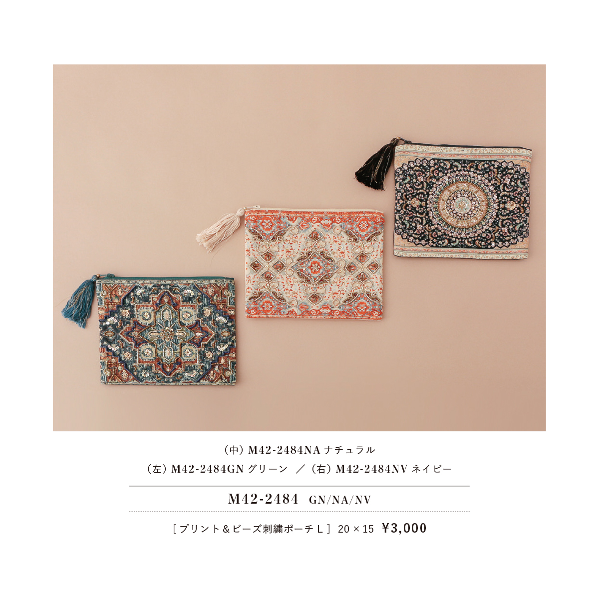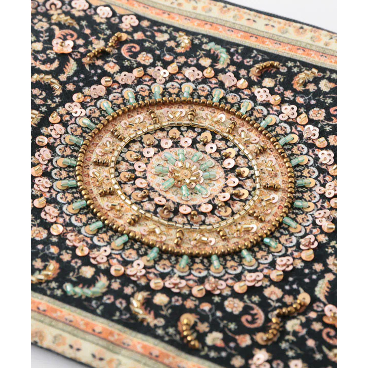 華やかなビーズ刺繍は全て職人の手作業により作られています。新作はインドのヴィンテージラグの柄をデジタルプリントした上にビーズ刺繍をあしらったシリーズや人気のボタニカルモチーフの新柄やメガネケースなどの新アイテム登場です。楽しげな雰囲気のパーティーシリーズのキーチャームは遊び心があり自分用にもギフト用にもおすすめのアイテムです。
