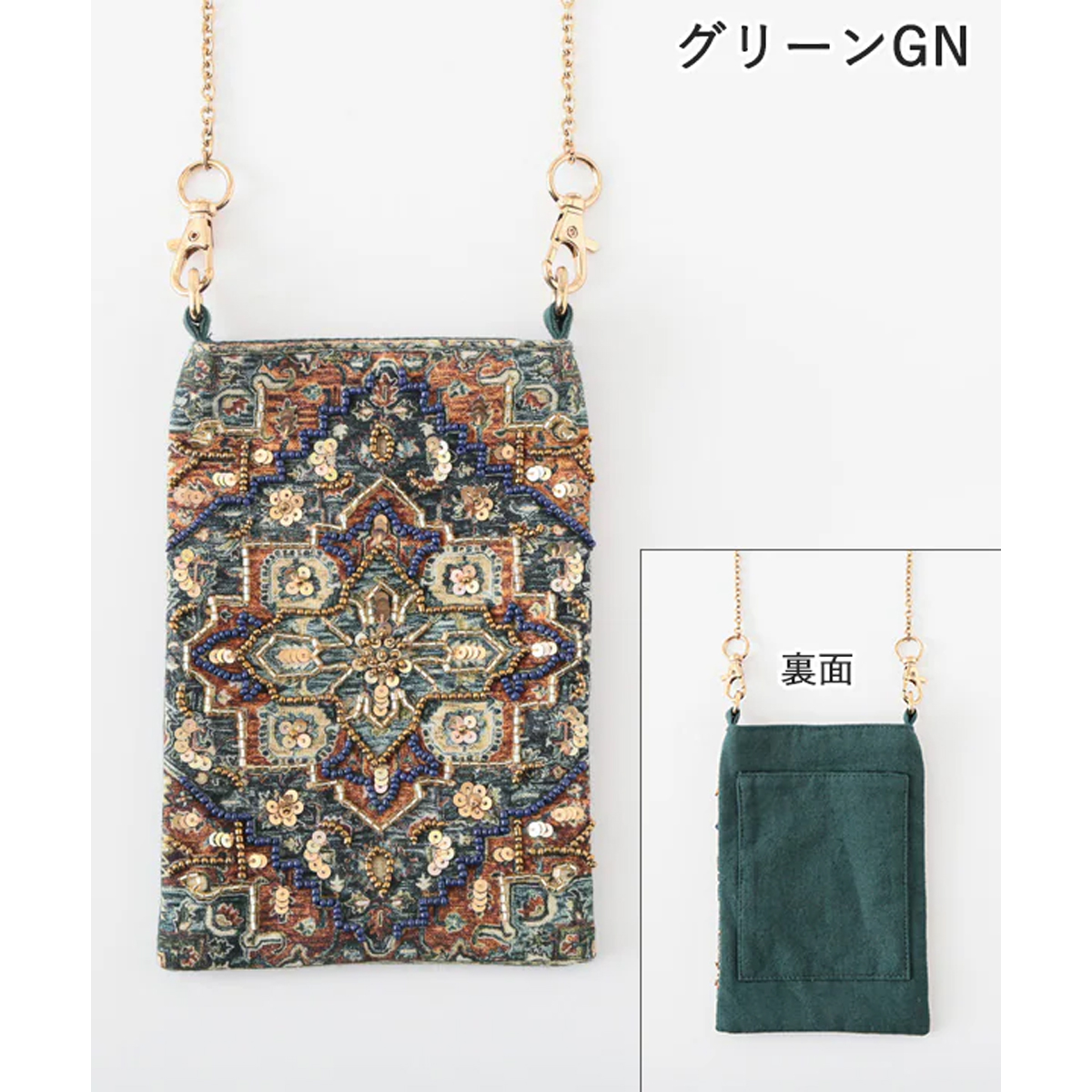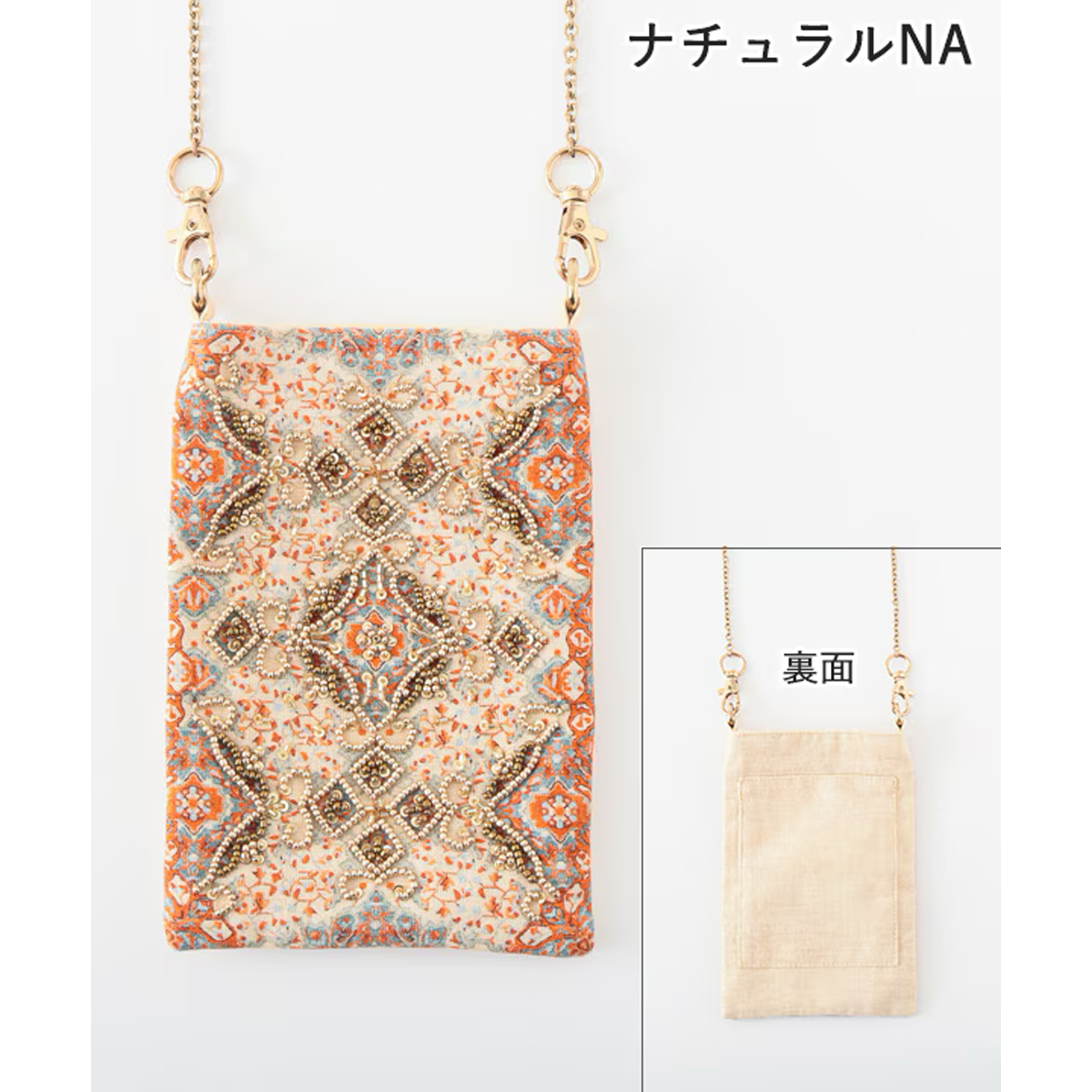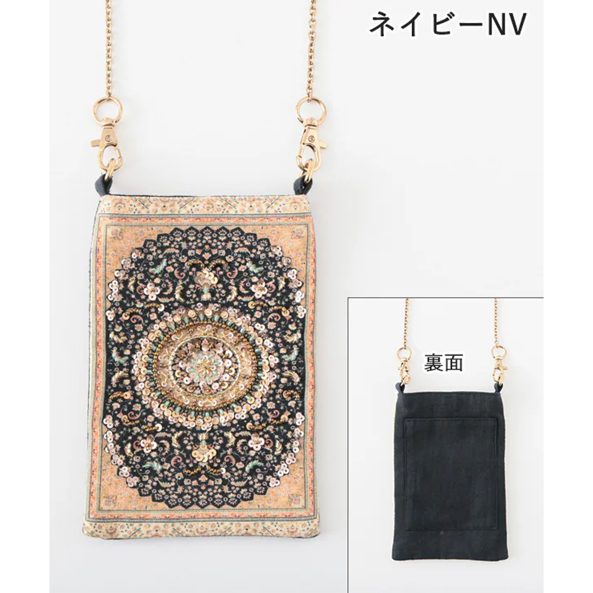 インドのヴィンテージラグの柄をプリントした上にビーズ刺繍をあしらったフォンポシェットの新作。マチの無い薄型使用なので主張も激しすぎず、大人っぽい雰囲気が好評です。