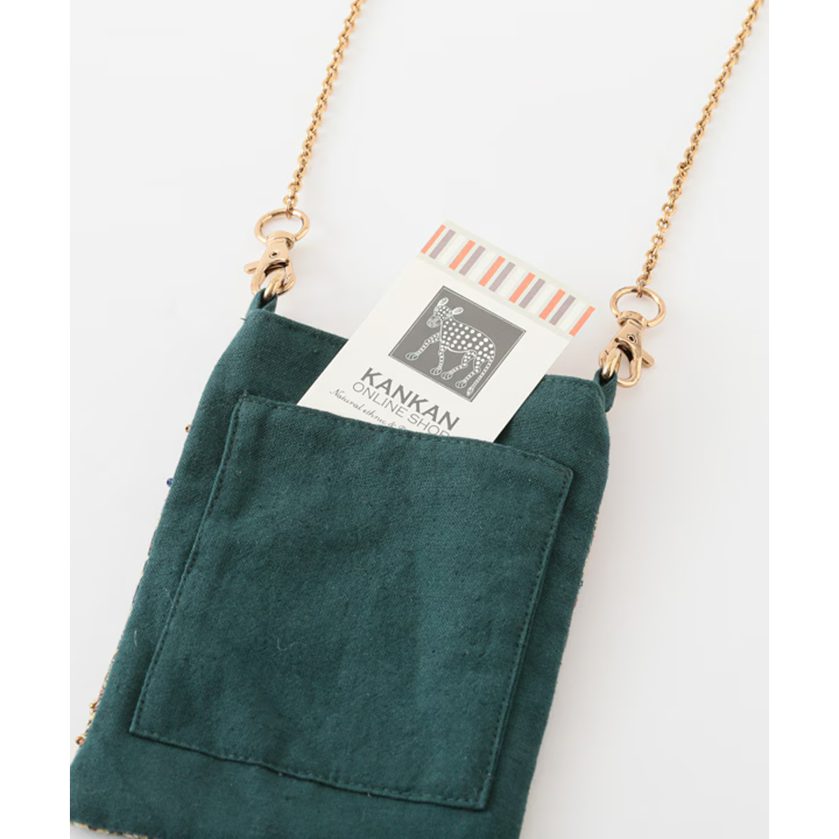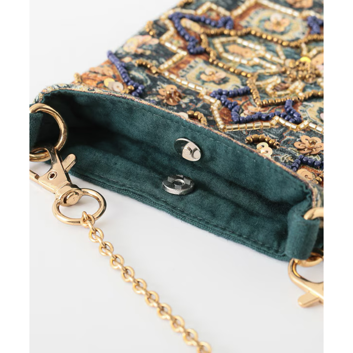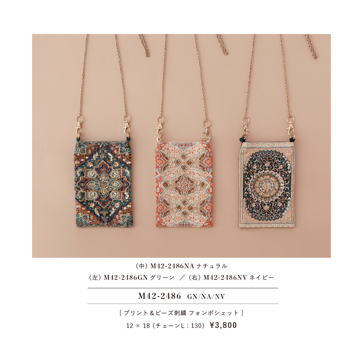 インドのヴィンテージラグの柄をプリントした上にビーズ刺繍をあしらったフォンポシェットの新作。マチの無い薄型使用なので主張も激しすぎず、大人っぽい雰囲気が好評です。