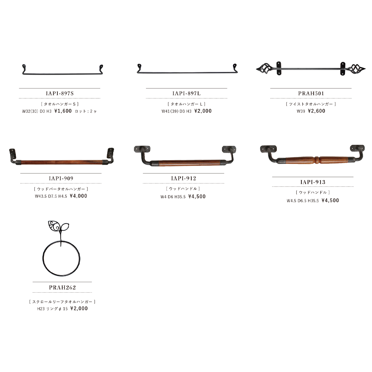 | サイズ | タオルハンガーS:W32(30) D3 H3 タオルハンガーL:W41(39) D3 H3 ツイストタオルハンガー:W39 ウッドバータオルハンガー:W43.5 D7.5 H4.5 ウッドハンドル IAPI-912:W4 D6 H35.5 ウッドハンドル IAPI-913:W4.5 D6.5 H35.5 スクロールリーフタオルハンガー:リングΦ15 H23 |