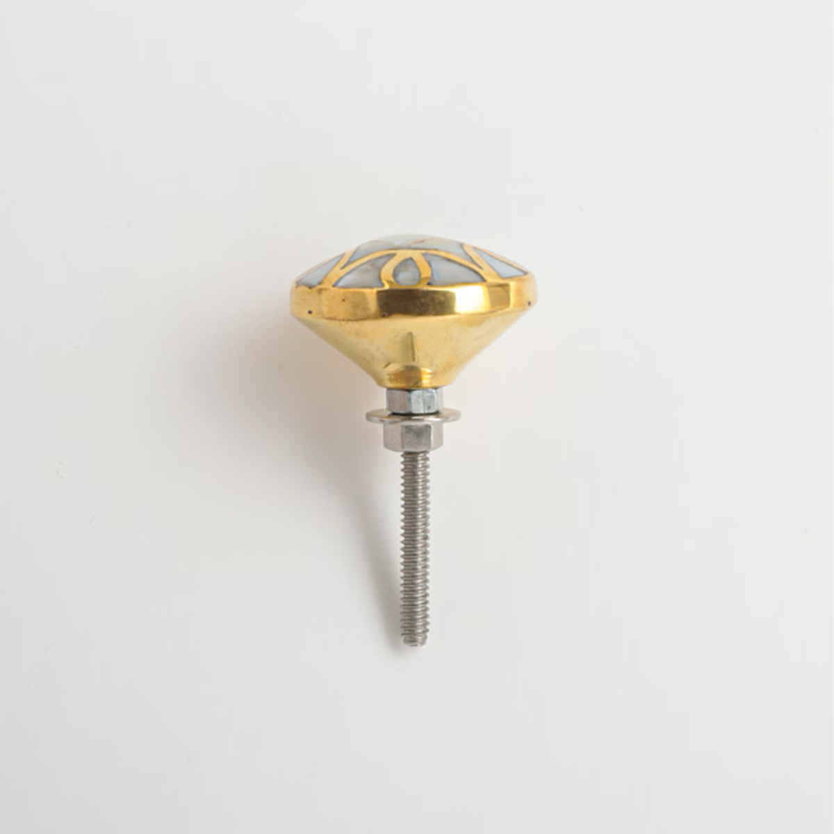 真鍮とシェルを組み合わせたアートなデザインのノブです。