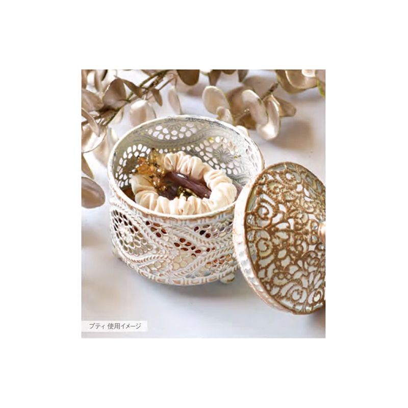 細やかな模様が可愛らしい蓋つき小物入れ。甘さの中にもエレガントな雰囲気がただよいます
