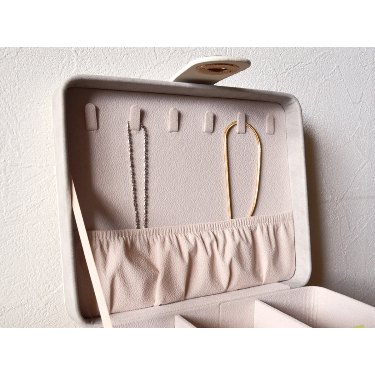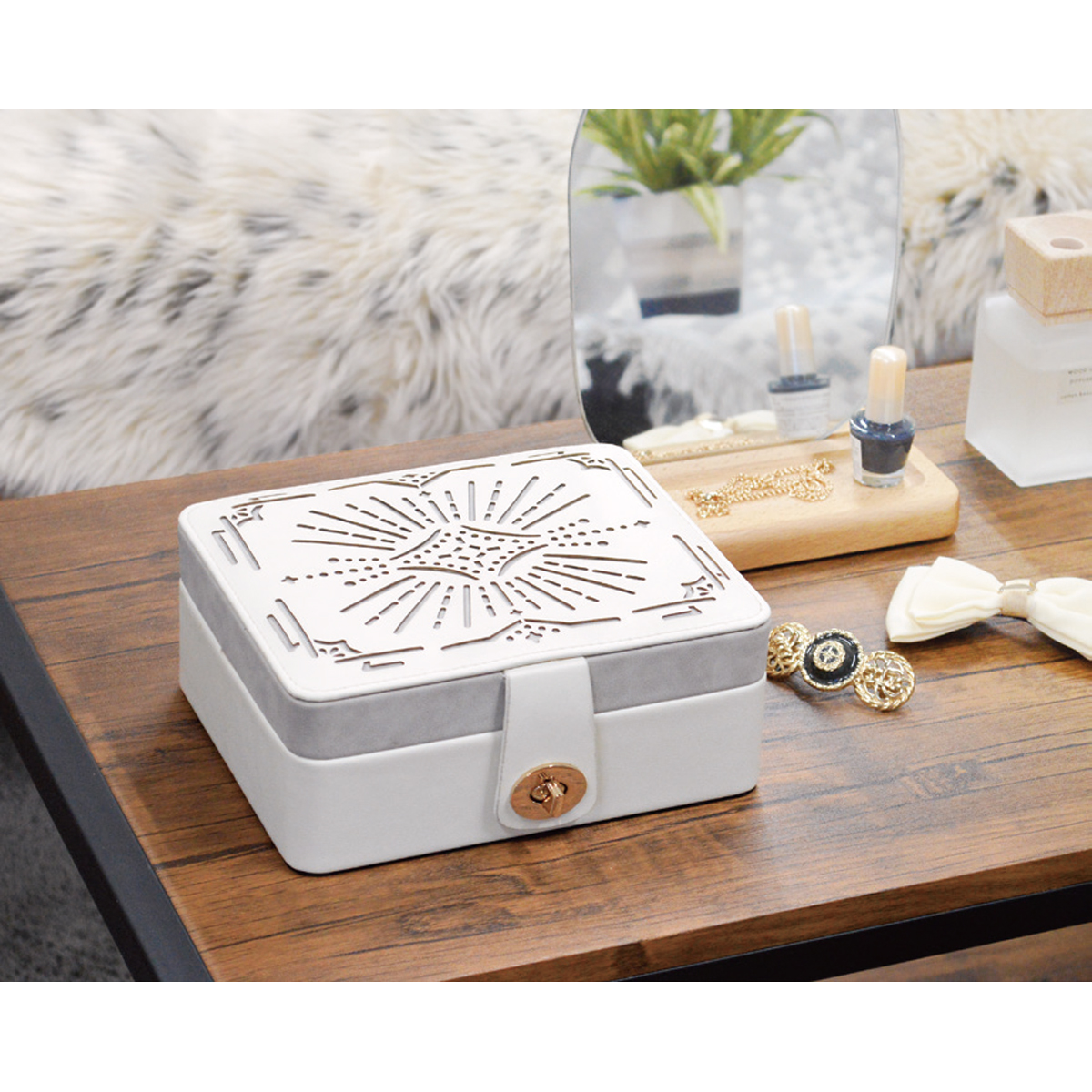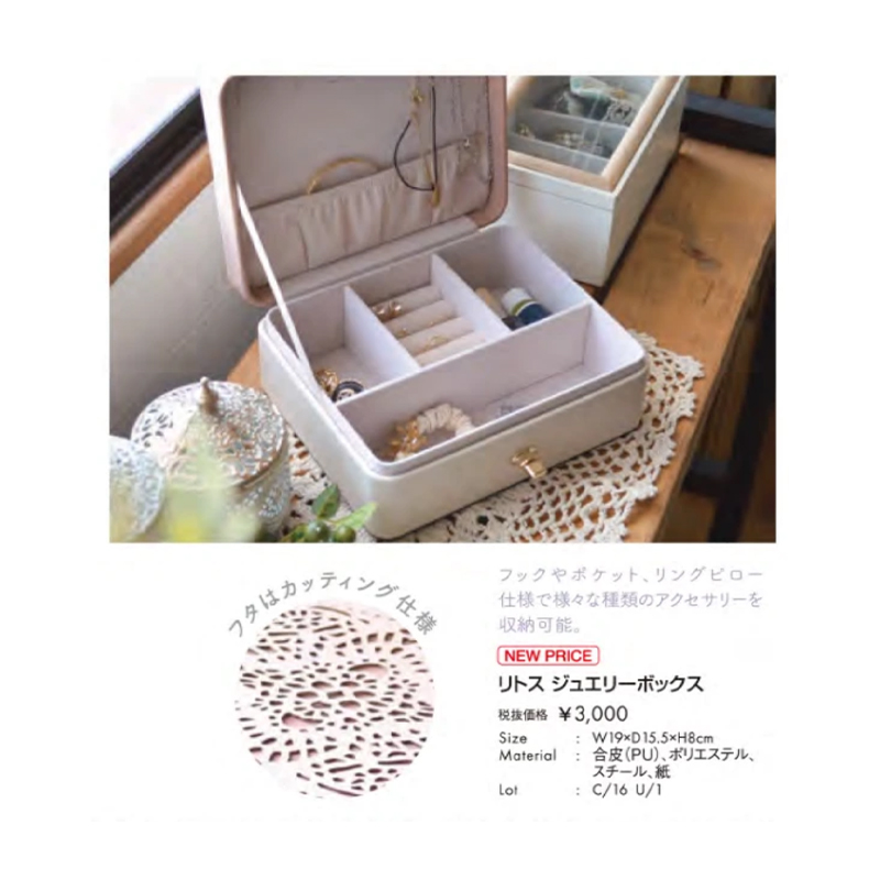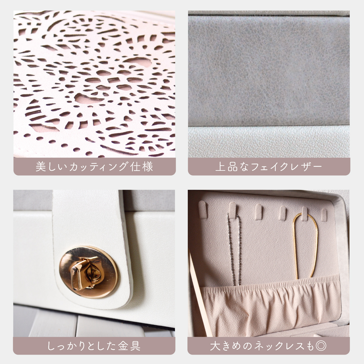 蓋のカッティングデザインが美しく、インテリアとしても素敵です。しっかりとしたフェイクレザーの作りで、フックやリングピローと使って沢山のアクセサリーを収納できます