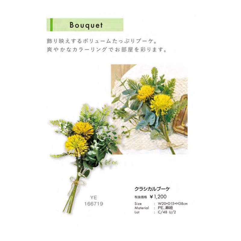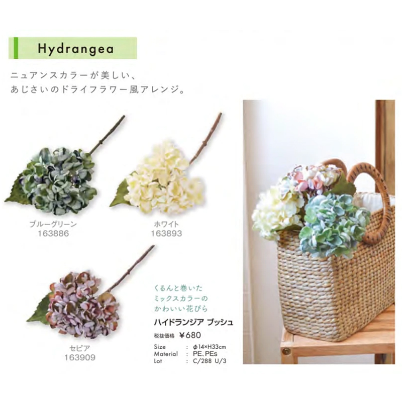 | 素材 | クラシカルブーケ:PE、麻紐 ハイドランジアブッシュ:PE,Pes |