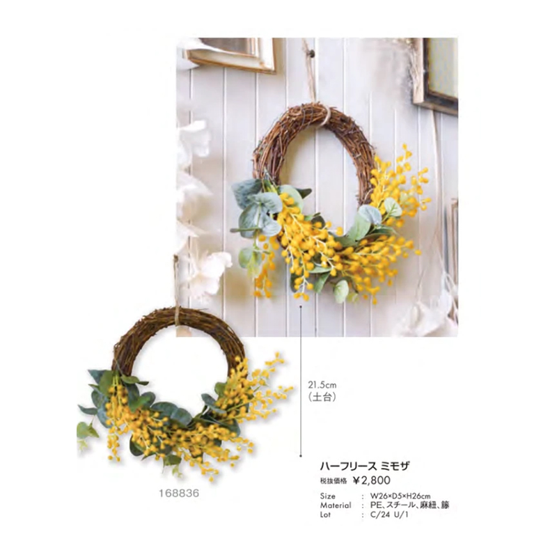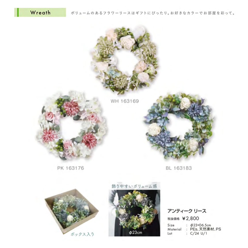 | 素材 | アンティークリース:PEs、天然素材、PS ハーフリース:PE、スチール、麻紐、藤 ユーカリ:PE ボックスウッド:PE |