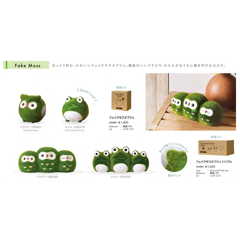 ほっこり和む、かわいいフェイクオブジェ。縁起のいいフクロウ、カエルがおうちに福を呼び込みます。