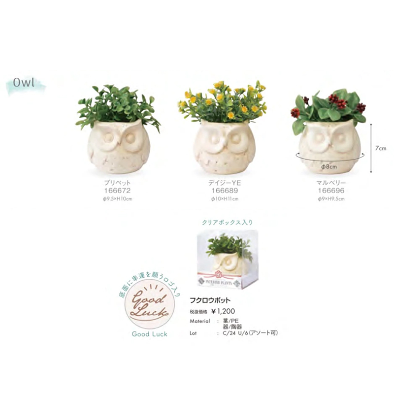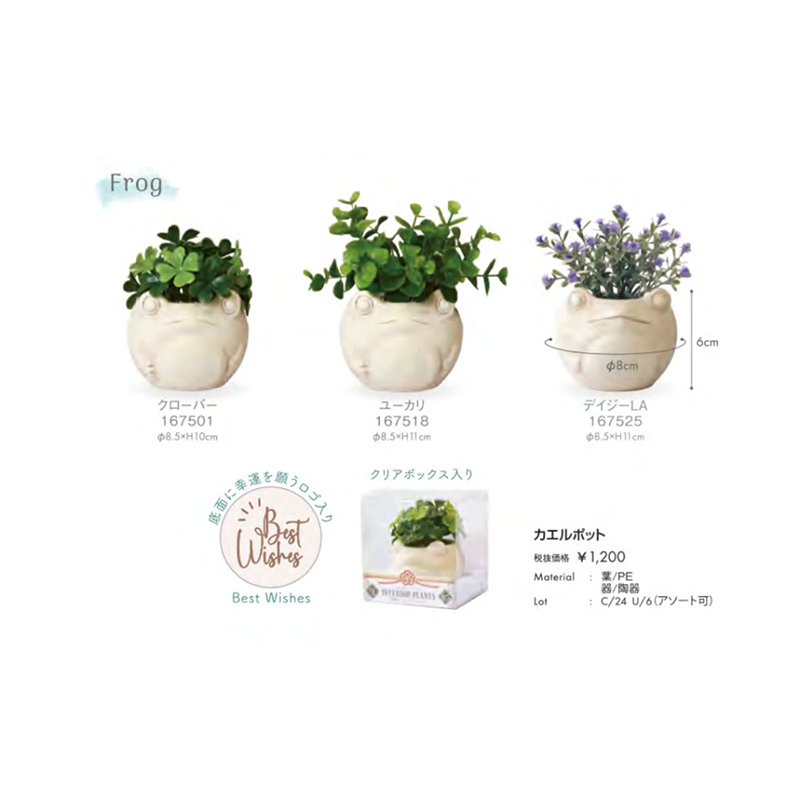 | サイズ | フクロウプリペット:Φ9.5xH10cm フクロウデイジーYE:Φ10×H11cm フクロウマルベリー:Φ9×H9.5cm ネコデイジーPA:Φ8×H11cm カエルクローバー:Φ8.5×H10cm カエルユーカリ:Φ8.5×H11cm カエルデイジーLA:Φ8.5×H11cm |