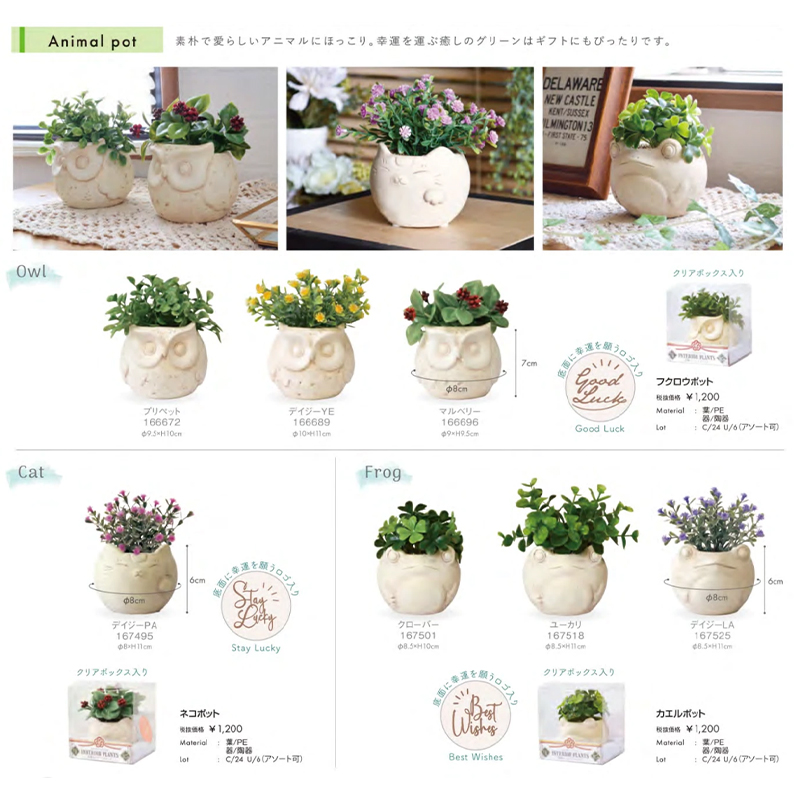素朴で愛らしいアニマルにほっこり。幸運を運ぶ癒しのグリーンはギフトにもぴったりです。