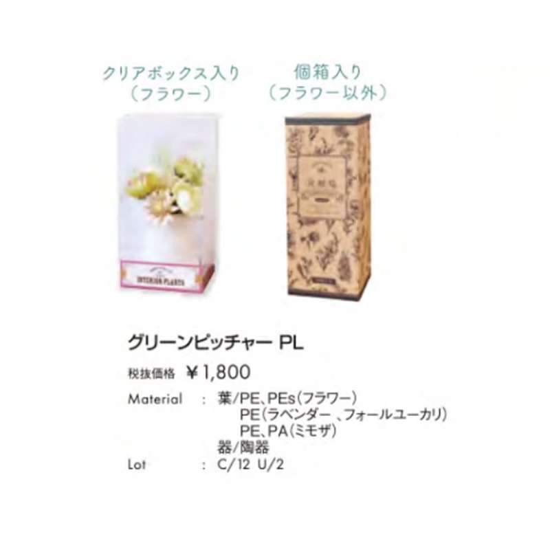 | 素材 | 葉/ PE、PEs(フラワー) PE(ラベンダー、フォールユーカリ) PE、PA(ミモザ) 器:陶器 |