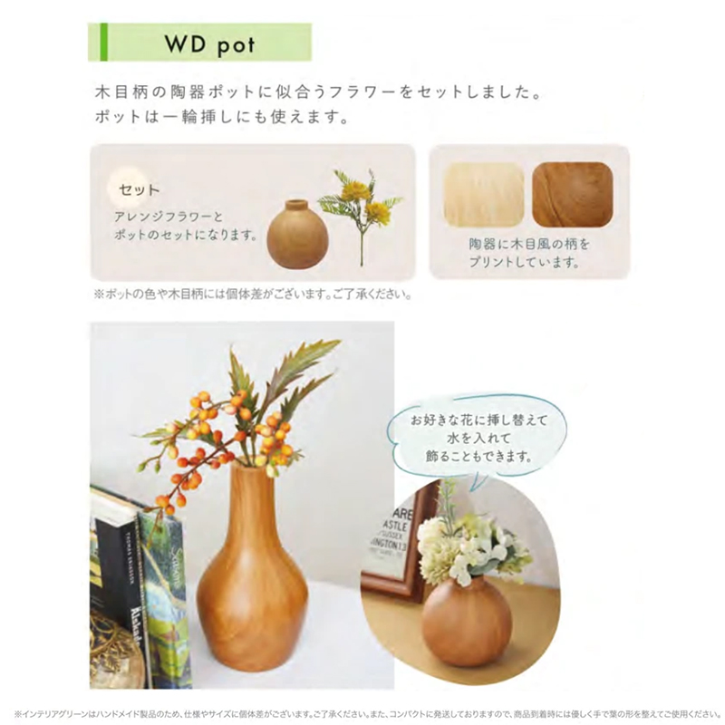 木目柄の陶器ポットに似合うフラワーをセットしました。