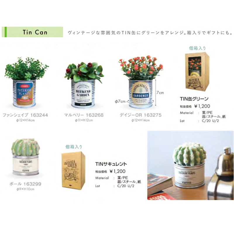 ビンテージな雰囲気のTIN缶にグリーンをアレンジ。個箱入りなのでギフトにもおすすめです