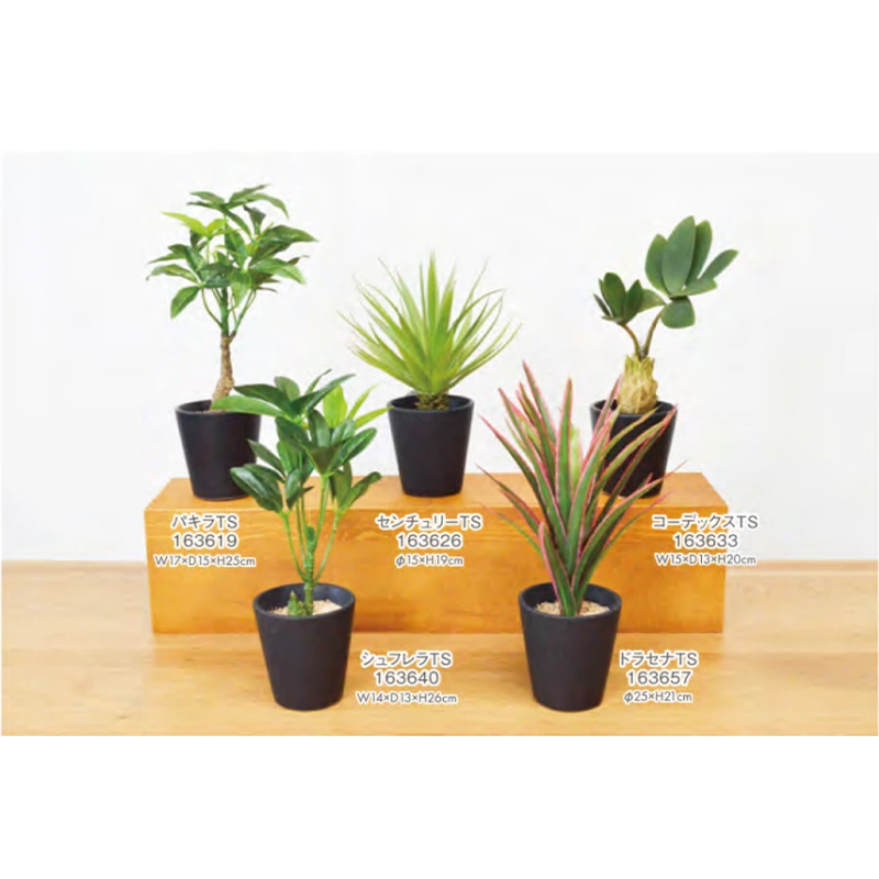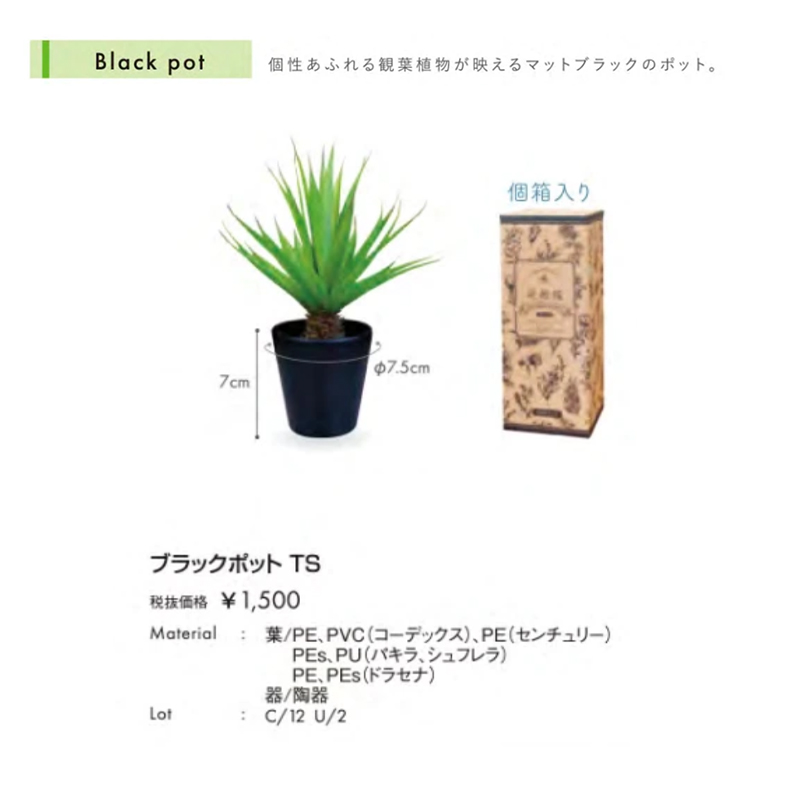 | 素材 | 葉/PE(フィットニア、カメリア) PE、PEs(シュガーバイン) PEs、PU(ジャロファ、アロカシア、パキラ) 器/陶器 |
