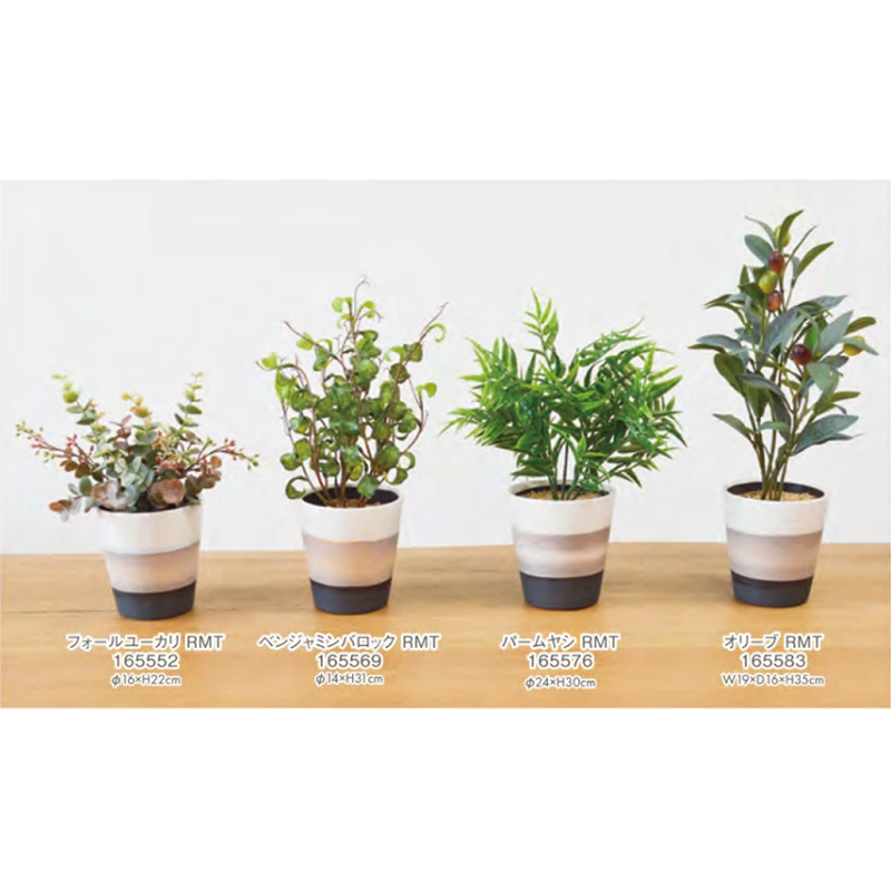 | サイズ | フォールユーカリRMT:約Φ16xH22cm ベンジャミンバロックRMT:Φ14xH31cm パームヤシRMT:約Φ24xH30cm オリーブRMT:約19x16xH35cm |