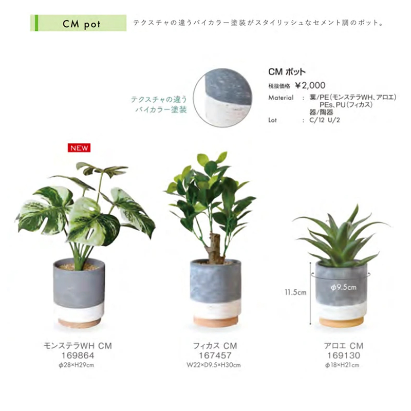 | サイズ | モンステラCM:Φ28xH29cm フィカスCM:W22xD9.5xH30cm アロエCM:Φ18xH21cm |