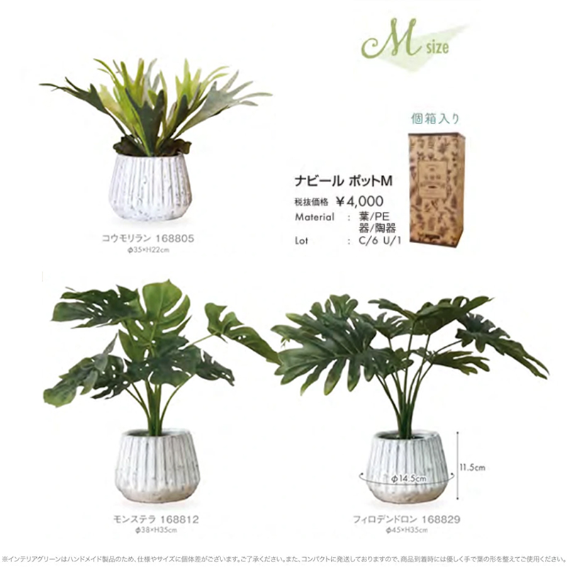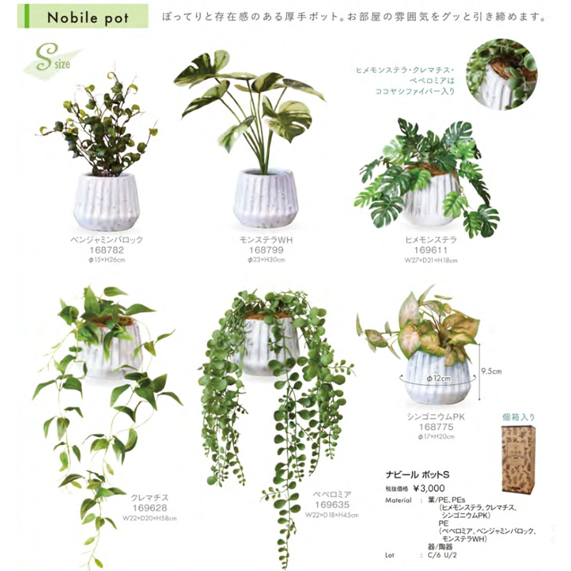 | 素材 | ナビールポットS 葉/PE、PEs (ヒメモンステラ、クレマチス、 シンゴニウムPK) PE (ペベロミア、ベンジャミンバロック、 モンステラWH) 器/陶器 ナビールポットM 葉/PE 器/陶器 |